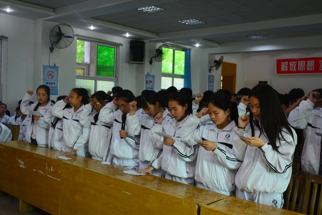 初三年级10个班,以班为单位,每个同学高举右手,在领誓同学的带领下,以青春的名义宣誓,吹响中考集结号,拚搏两个月,让人生在六月闪光,让梦想在六月飞翔。