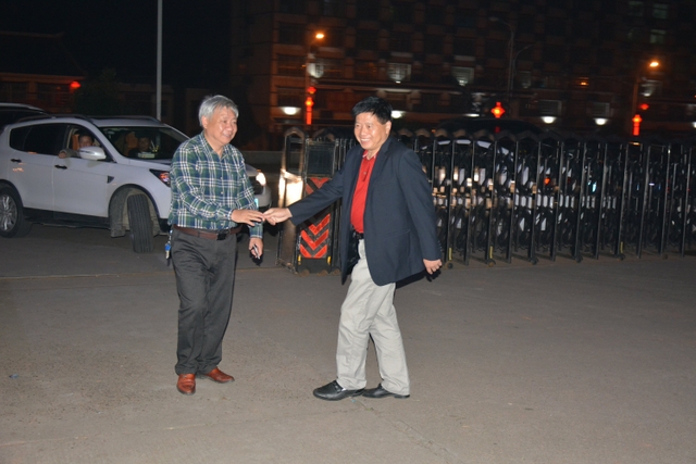 学校宣传处主任郑少君(右)代表罗校长到南校门迎接来自家乡的客人,喜不自禁