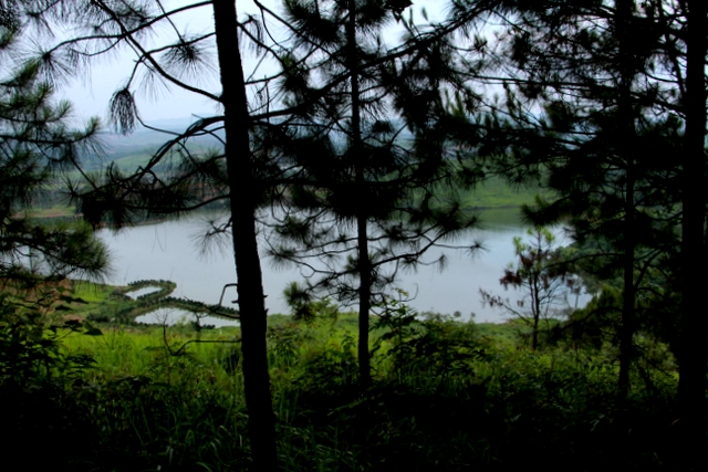 往山下一看,泮塘村两边的山脉,正对着中间的一个山头,那二龙戏珠的地形,真是惟妙惟肖。从这个角度看,泮塘水库又像打开一面宝镜,照出了四周青山的雄姿。
