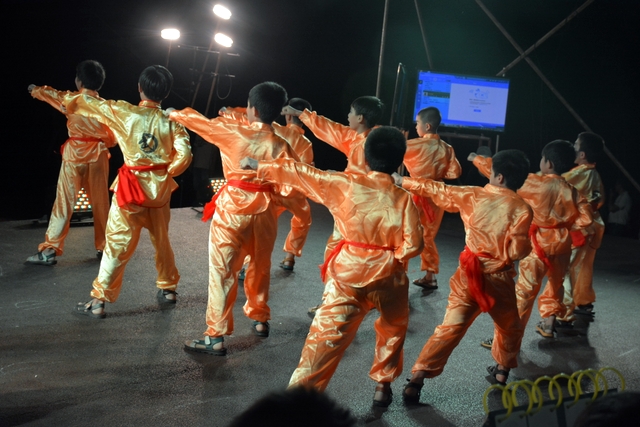 每两个环节之间穿插了互动和娱乐节目。互动节目为暂时领先的代表队抽签两个班级,一方说人物特征,另一方猜相应人物,猜对了获得纪念品。这时台下一片欢呼声,每一个班都希望能上台一展身手。相声《读好书》、话剧《智取生辰纲》、武术《男儿当自强》、舞蹈《大王带我来巡山》,或诙谐幽默,或活灵活现,或虎虎生风,或舞姿轻扬,让观众从扣人心弦的紧张氛围中放松开来。最后,再由几十名同学走上舞台,罗校长亲自带领台上台下的全体学生齐声高唱《好汉歌》,响彻云霄,气贯长虹,把这个活动推向高潮!