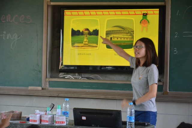 志愿者老师为激发学生兴趣,用电脑将清华大学的主要景点诸如古朴的校门、水木清华、图书馆等放映在黑板中间的显示屏上,学生们听得兴味盎然,看得津津有味。