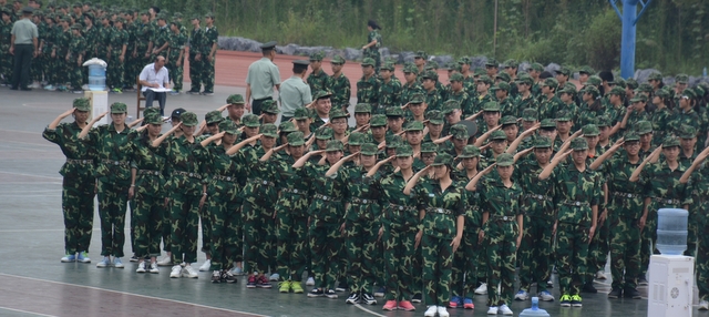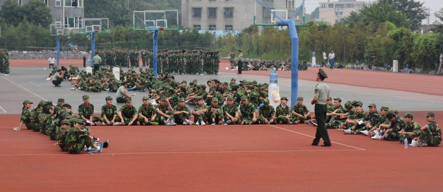 有的聪明教官从学生中选个嗓门大的站在队伍前发号施令,学生说起那些黑对手损对手的说辞比教官更起劲,有的还会改编教官的说辞,让场上气氛更加热烈。