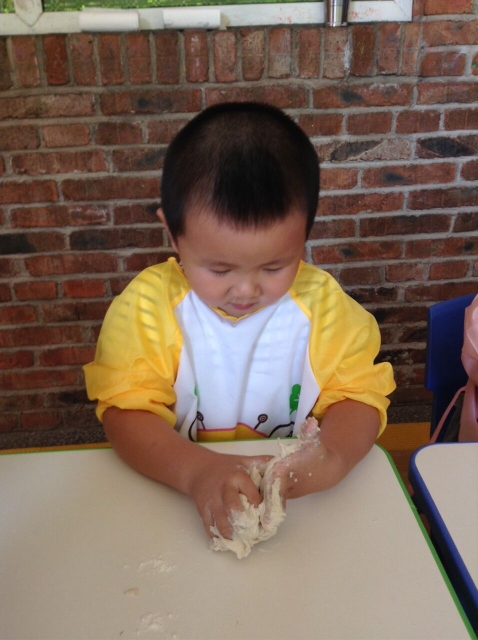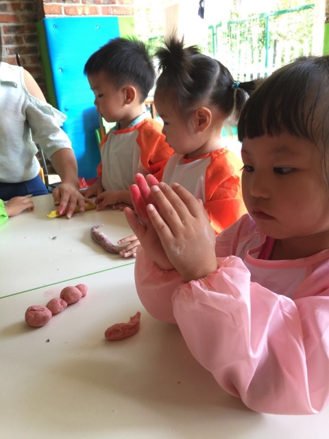 揉面团、上颜色、捏成型:先让小朋友体验面粉的手感,然后加水揉面团…