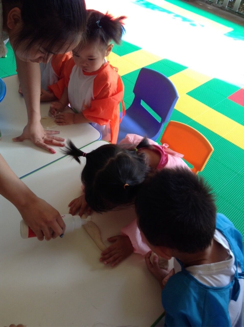 三原色混色小实验:红色+蓝色=紫色; 黄色+红色=橙色; 黄色+蓝色=绿色; 小朋友们为这神奇的魔法激动不已。