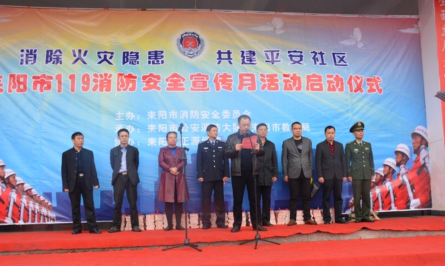 活动仪式由市政府副县级干部曹晓道主持,副市长提名人、市公安局党委书记、局长邓朝晖作主题讲话,并宣布:耒阳市2016年119消防安全宣传月活动正式开始!