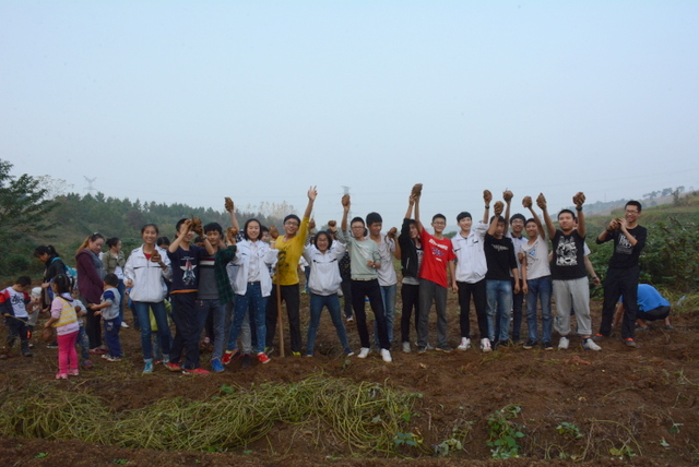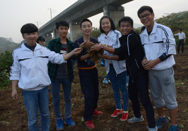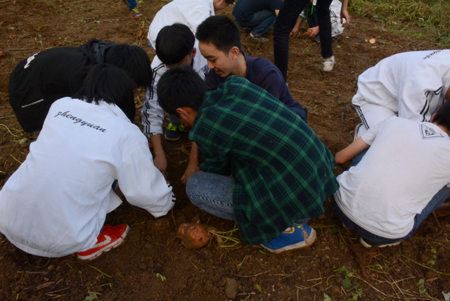 由于锄头数量不够,……同学便“手动”开始刨红薯了(谭媛)。只见同学们成了小聚落,散布在黄土地上,仿佛绿叶丛中点缀的几簇花团,尤为怜爱(罗依婷)。我和其余四个同学在地里“扫荡”,不停的在找猎物——红薯。我们有过几次特大的收获,但也有几次令人啼笑皆非的“糗事”:开始,我们团一直在找果藤很粗的地,坚信一定能挖到大的红薯,结果却是足足挖了半个小腿深的坑,却只得到一根巨大的藤,其余空空如也(谭媛)。