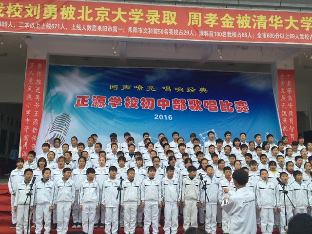 初一年级35个班级,两两组合成为一支队伍参加演唱。每支队伍需演唱两首参赛歌曲,一首是必唱曲目《松花江上》,另一首是班级自行选定歌曲。一首由297、298班演唱的红色经典歌曲《我们走在大道上》拉开了本次合唱大赛的序幕。欢快激扬的旋律,鼓舞人心的歌词“披荆斩棘奔向前方,向前进!向前进!革命气势不可阻挡,向前进!向前进!”。演唱的同学们情绪高涨、意气风发,倾听的同学也是激情澎湃、热情洋溢。