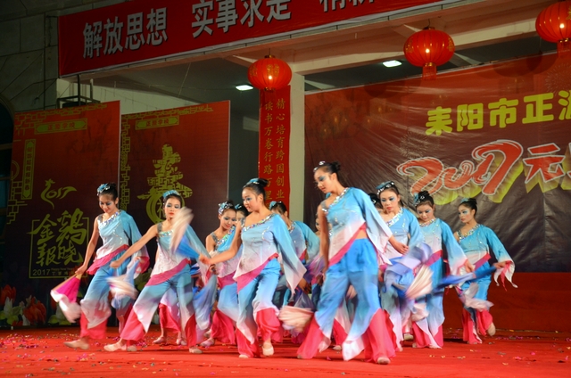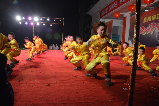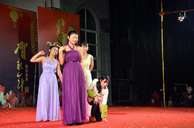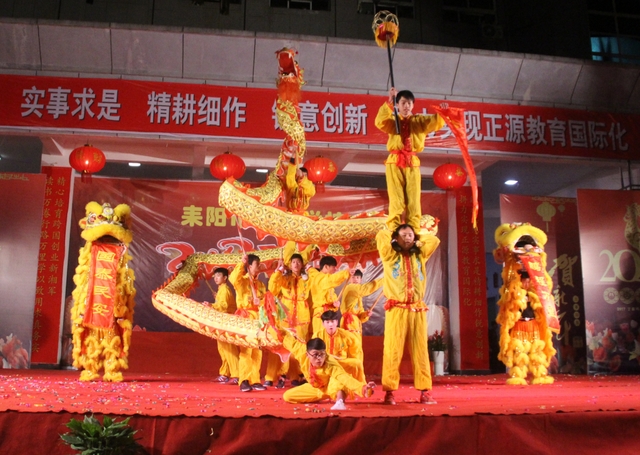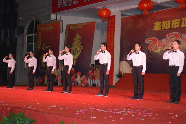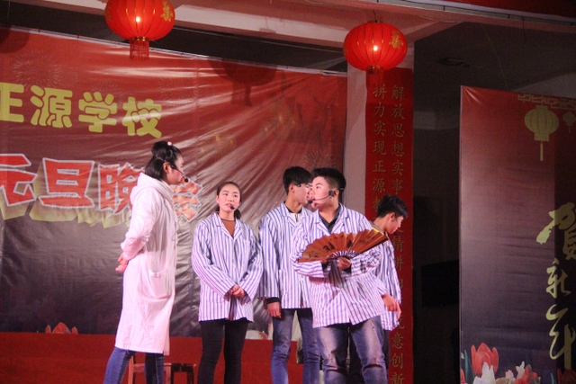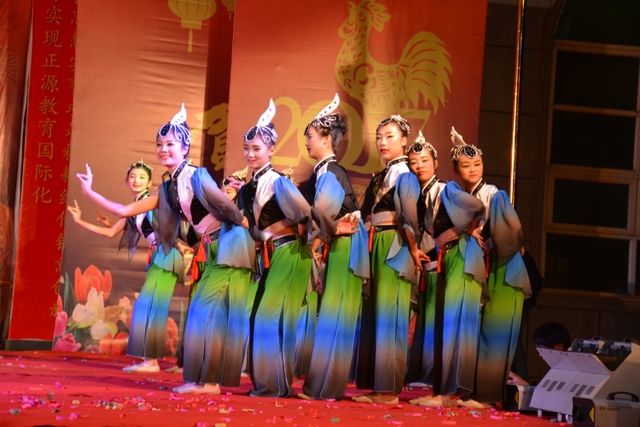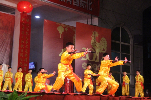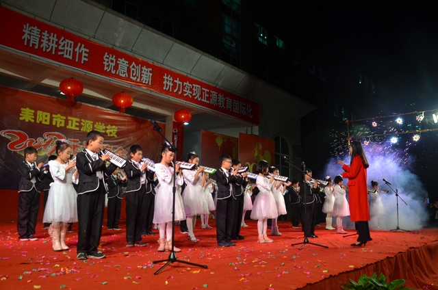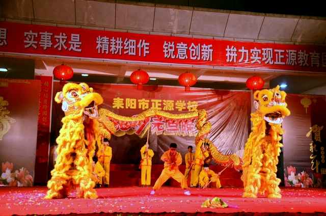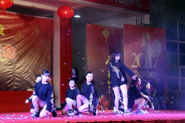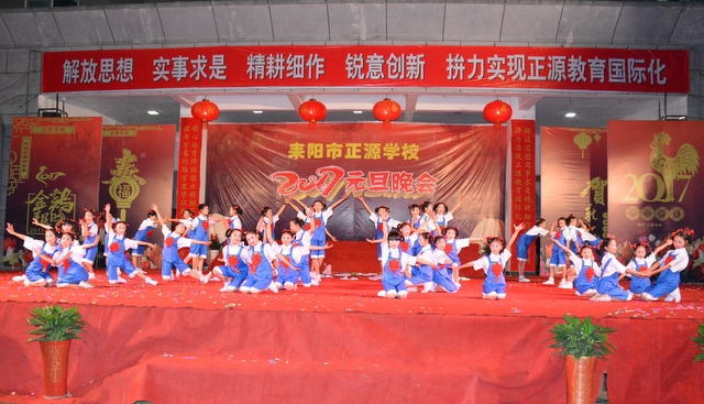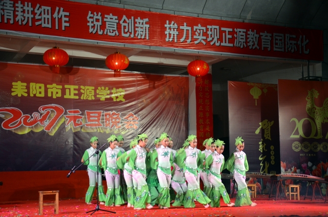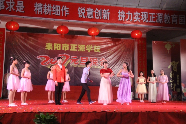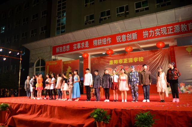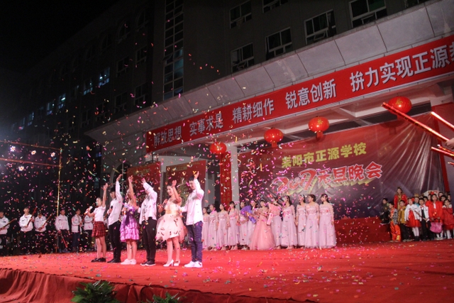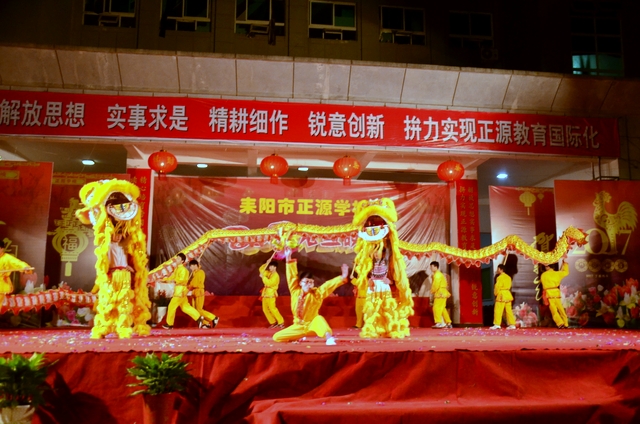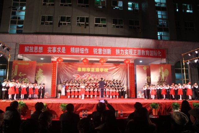 晚上六点刚过,夜幕降临。从小学六年级到高中三年级,同学们便开始陆陆续续走进广场。只见,舞台上方横挂着“解放思想 实事求是 精耕细作 锐意创新 拼力实现正源教育国际化”显目标语,两边张贴着“解放思想实事求是精耕细作锐意创新拼力实现正源教育国际化 读书万卷行路万里学以致用求真务实精心培育跨国创业新湘军”的对联,四盏大红灯笼高县上方,正中一块巨大的背景布上鲜花簇拥着今晚的活动主题。背景布两侧,分别另有两块活动背景布,一边的主题是“金鸡报晓”,另一边的主题是“恭喜新年”。舞台两侧各有两排共12盏投光灯,两盏聚光灯,台下前方两侧各树着两盏远射灯,一起投向铺着鲜红地毯的舞台,使整个舞台流光溢彩,金碧辉煌,一派浓浓的节日喜庆气氛。
