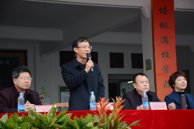 学校办公室主任朱明之主持大会。在主席台上就座的学校领导还有:财务总监梁晓芬,工会主席陈斌,初中部主任曾良古,小学部主任罗俊豪,以及学校教务主任王大昌,教研主任李清朵,团委书记兼宿管部主任周文根,校长助理王小灿,宣传处主任郑少君。
