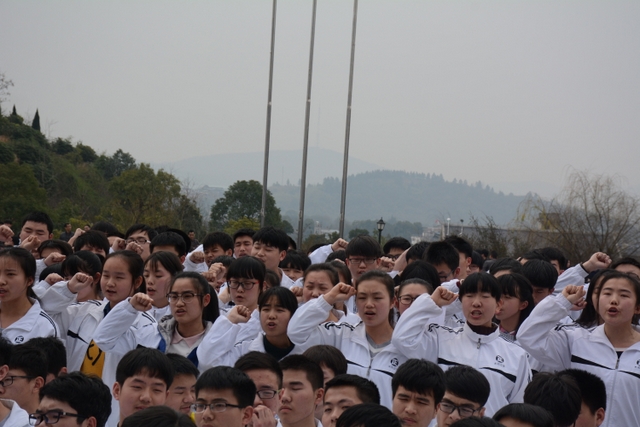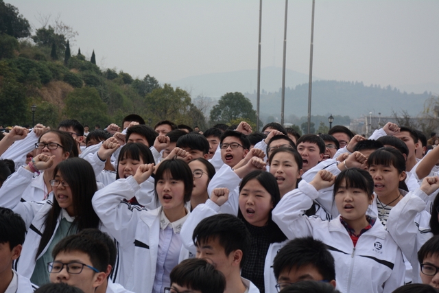 “数风流人物,还看今朝。”高三全体学生庄严宣誓。23个班级的同学分别在领誓人的带领下,高举右手,为自己高考100天冲刺阶段许下铮铮誓言。他们斗志昂扬、意气风发、气势磅礴,让在场的一万五千名师生为之震撼。学校德育处主任兼高三年级主任王伟荣对高三学子提出寄语,并带领全体高三教师进行了庄严宣誓。