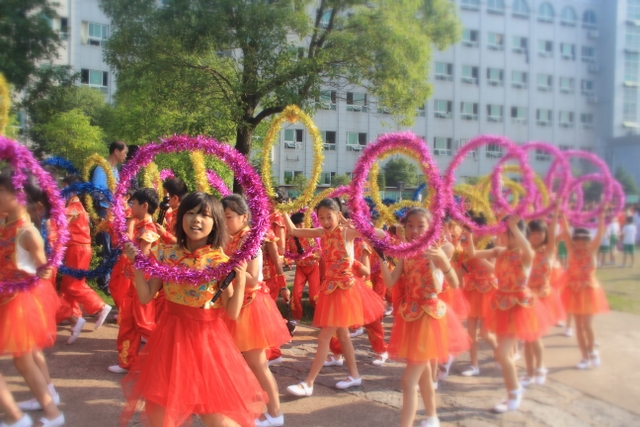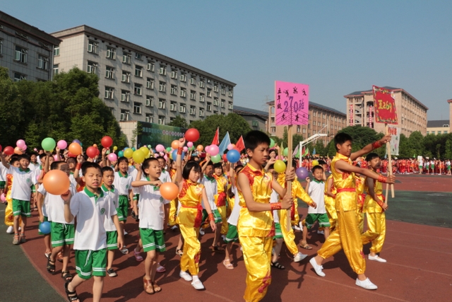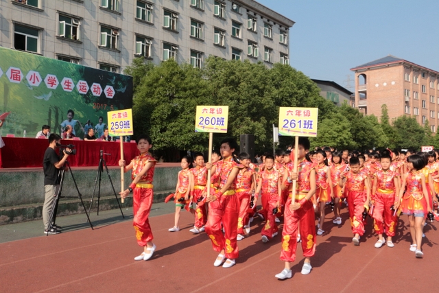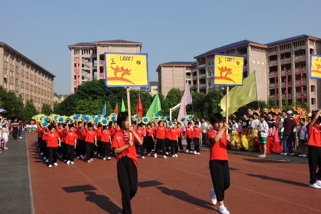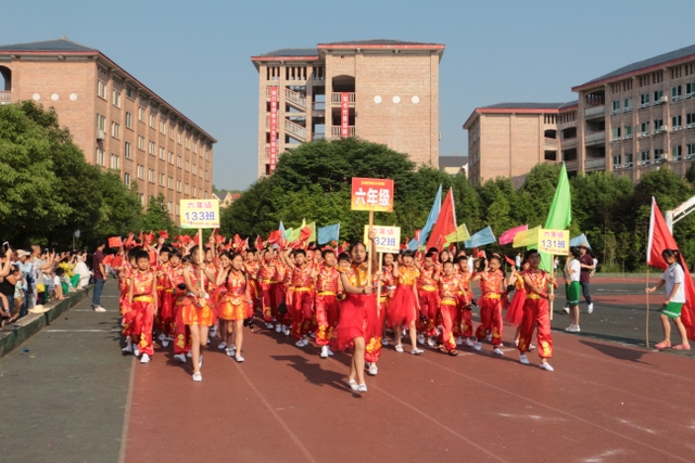 接下来是各年级方阵入场。各年级服饰、道具匠心独运,别具一格,争奇斗艳,引人入胜。他们高喊着不同的口号,昂首阔步,从主席台前走过。六年级的同学身着彩色服装,手拿葫芦丝;五年级同学身着武术服装和校服,手执气球;四年级同学头顶五颜六色的花环,手戴雪白手套;三年级同学着装上红下黑,手执向日葵;二年级同学挥舞气球;一年级和幼儿班的同学们手腕上套着彩色花球,琳琅满目,美不胜收。