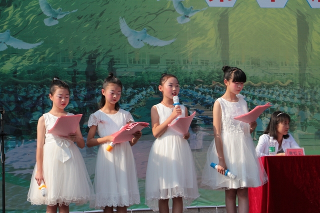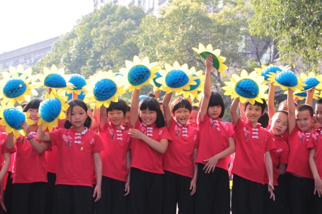 幼儿班的117名同学表演水果拳,五年级425名同学表演少年拳,又把观众带回到了爱过红妆爱武装的现场。幼小的身体,摇曳多姿,多么美妙,多么可爱。五年级同学表演的“音标操”,把音标学习与运动体操有机结合,别出心裁,令人拍手叫绝。