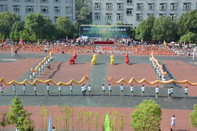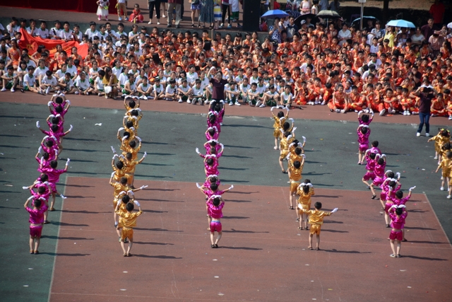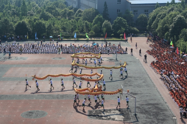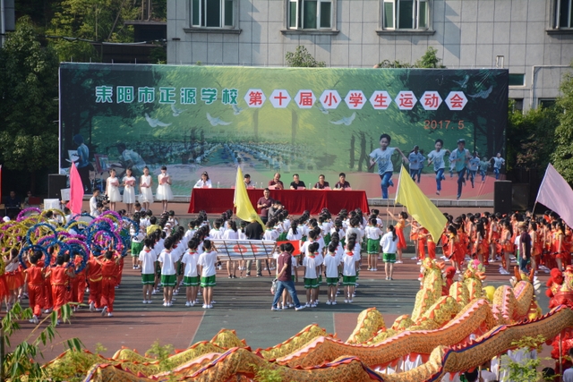 开幕式节目表演开始了。六年级48人组成的龙狮队率先亮相。四条巨龙金光闪闪,张牙舞爪,腾云驾雾,横空而来。时而如卷巨浪,翻江倒海;时而欲上九天,翘首揽月。两只黄狮、两只红狮在巨龙间穿梭,时而站在膝上摇头晃脑,时而抱着腰间半空旋转,时而亲昵戏谑,时而顶马爬臀,春风得意之时口吐莲花:祝正源校运昌隆……全场掌声雷动,经久不息。