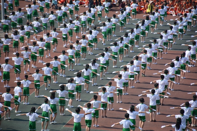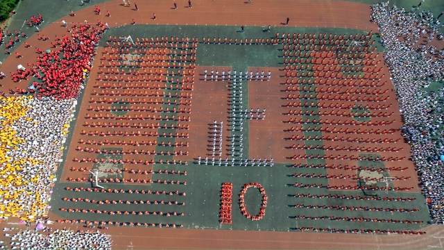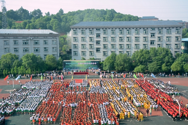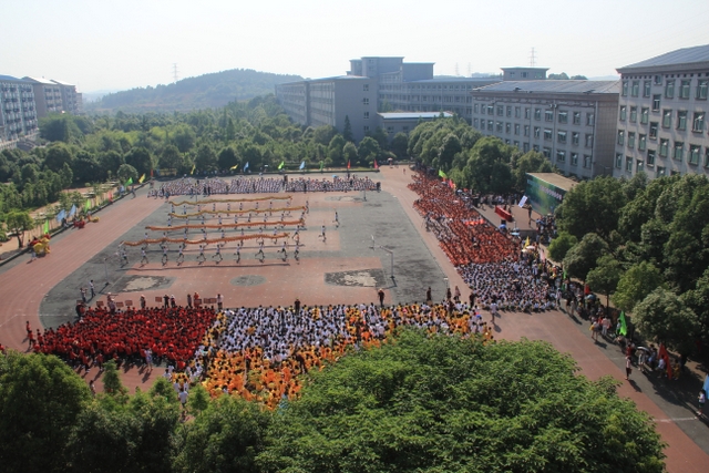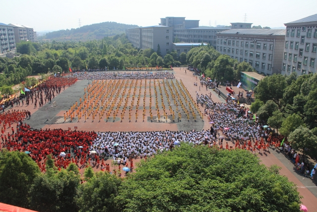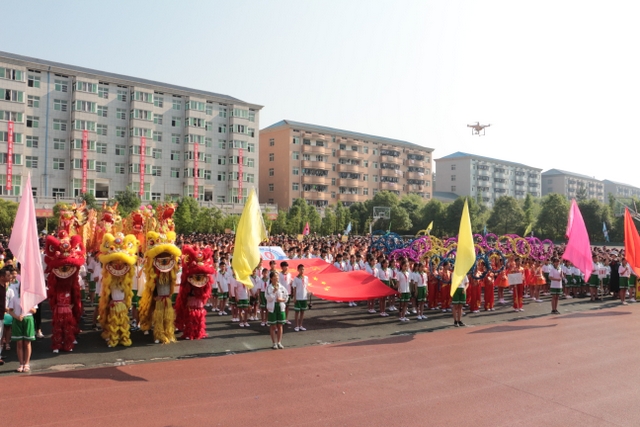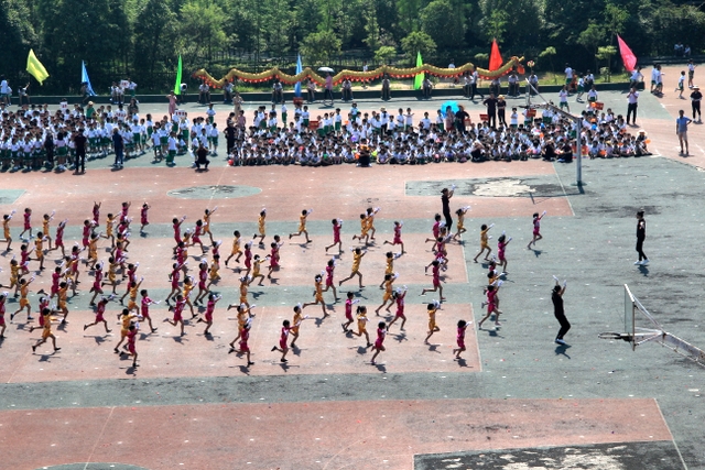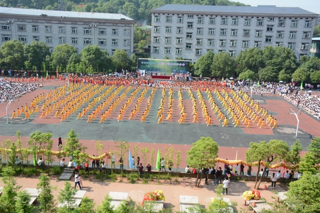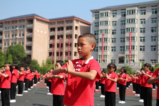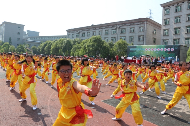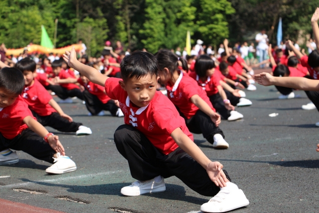 三年级全体学生628人表演五步拳。鲜红的上装,漆黑的运动裤,雪白的运动鞋,色彩鲜明。在台上指导老师的指令下,台下学生敬礼,礼毕,左弓步出拳,右弓步出拳……口令刚劲有力,动作虎虎生风,一曲《中国功夫》的伴唱更是把氛围推向极点。