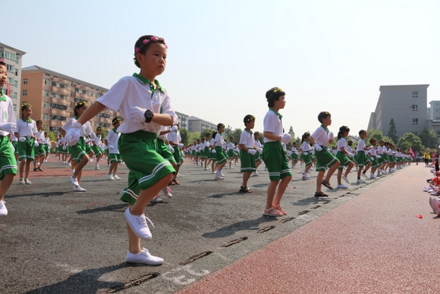 欣赏了激烈的龙争虎斗,刀光剑影,接下来是歌舞升平,文质彬彬。一年级442名同学表演健美操。四年级560名同学表演韵律操。萌萌哒音乐与萌动的肢体动作相结合,童真与激情舞动,活力与动感融合,美不胜收。