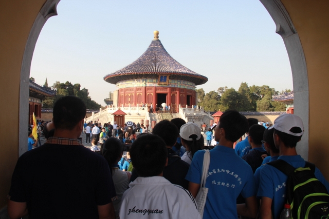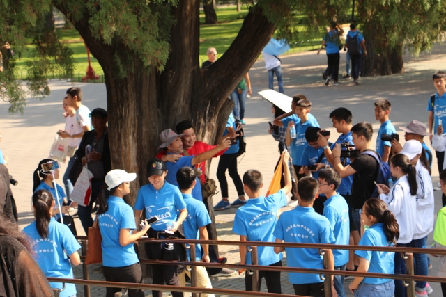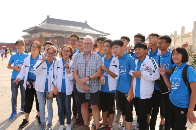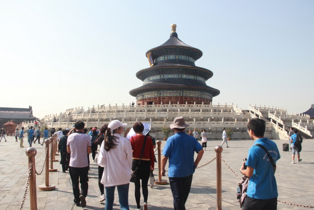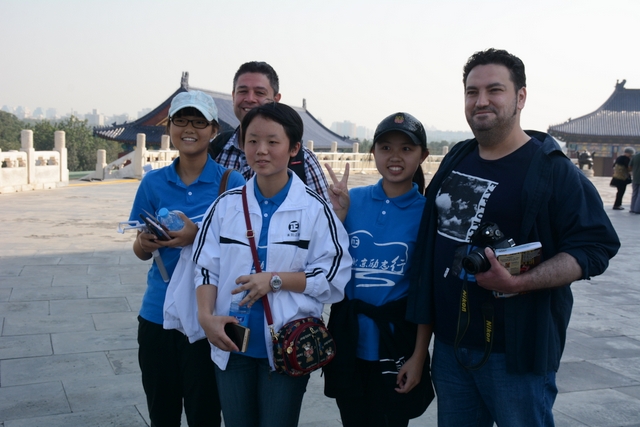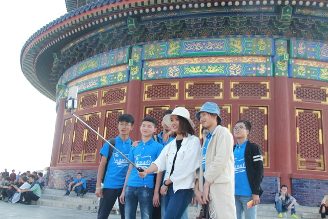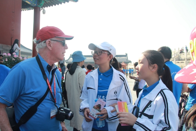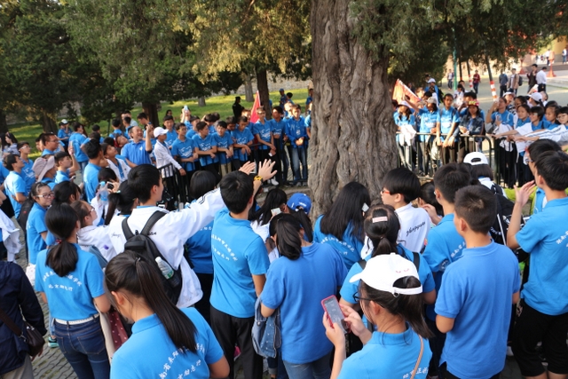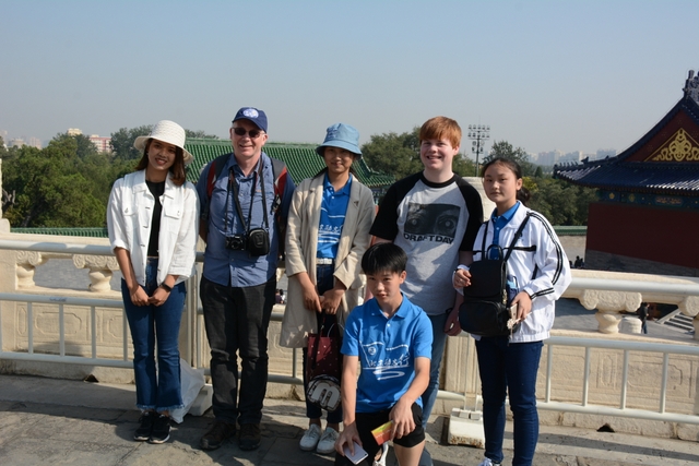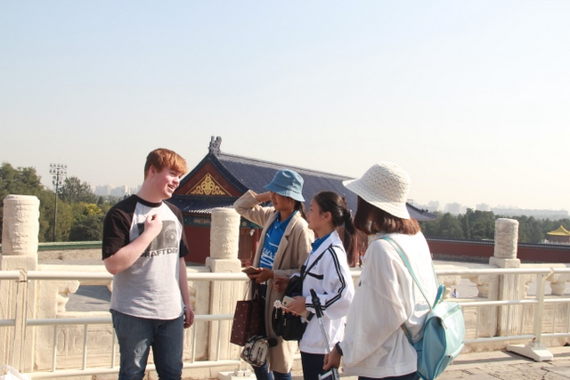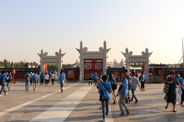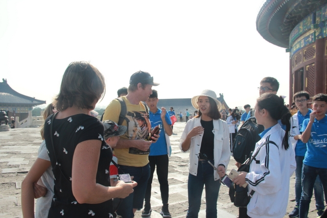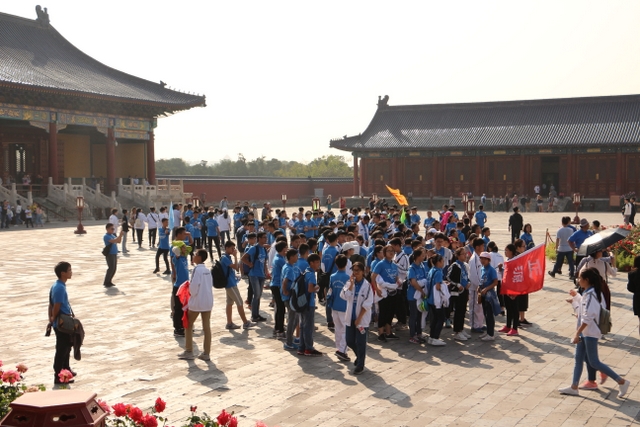 在天坛公园内,励志行团队按照既定路线,游览了祈年殿、皇穹宇、回音壁、圜丘等景点。在园内,学生们积极与各国游客交流,介绍家乡耒阳,并通过外国友人了解各国的风土人情。