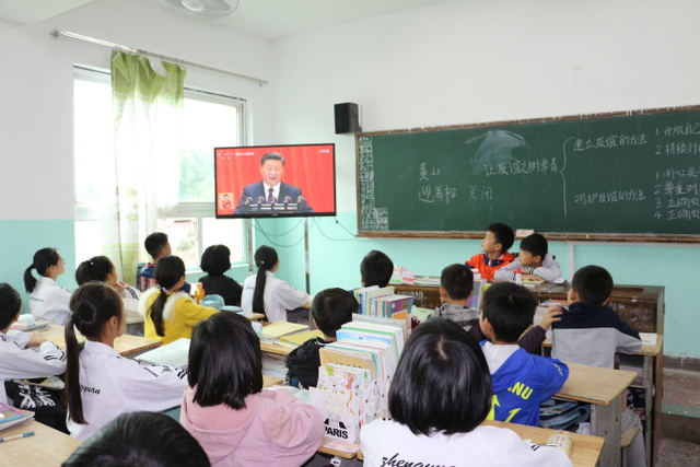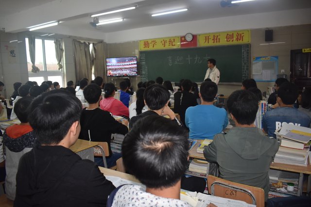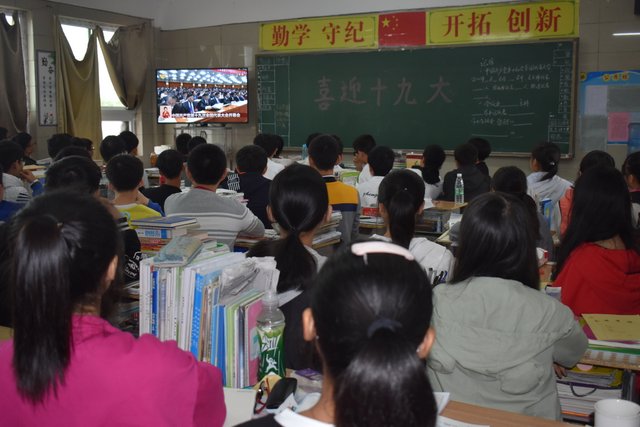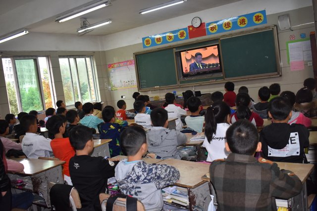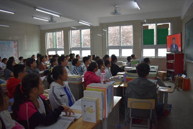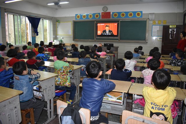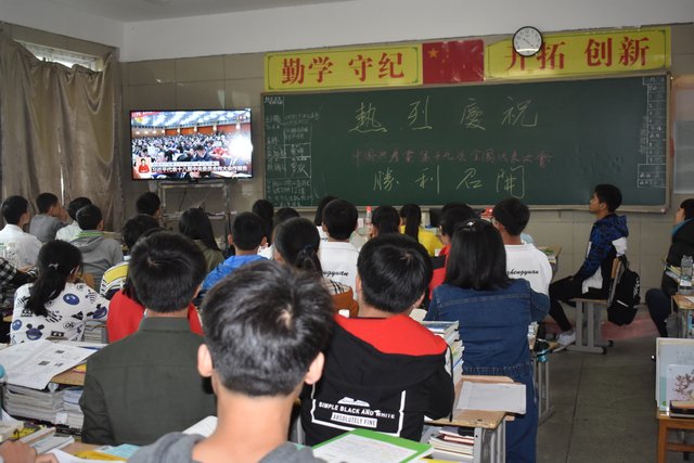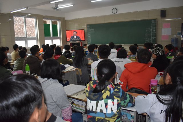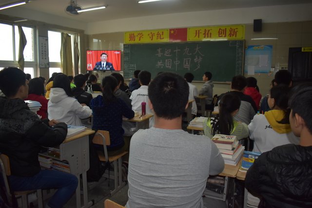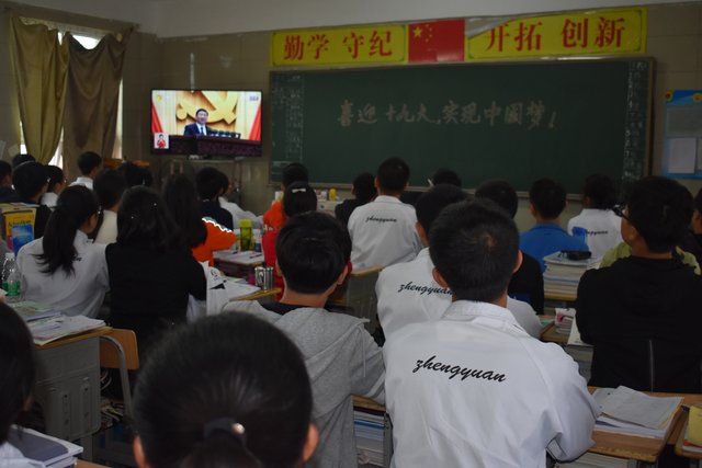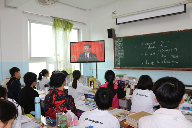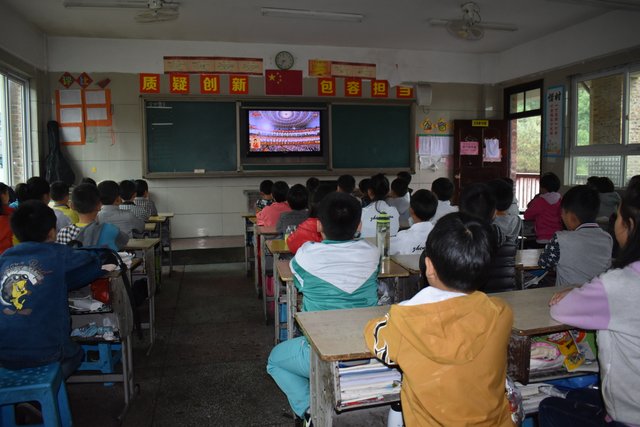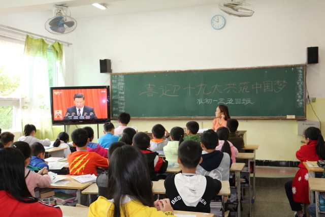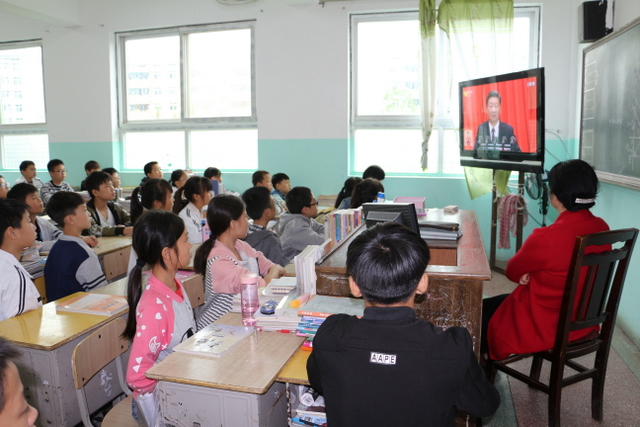 从幼儿园、学前班,到高三,各班同学端端正正地坐在自己的座位上,目不转睛地看着前面的电视机,聚精会神地听着习总书记工作报告里所讲的每一句话,每一个字,有的同学还不时地做着笔记。每当听到精彩之处时,教室里总是一次又一次地响起热烈的掌声。