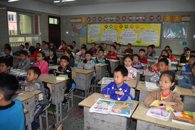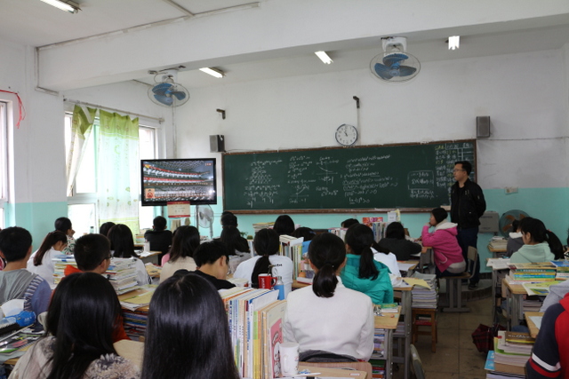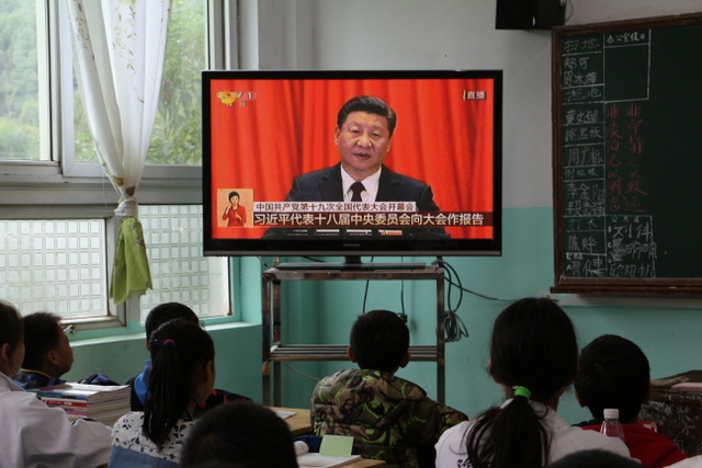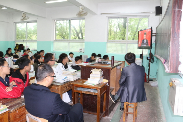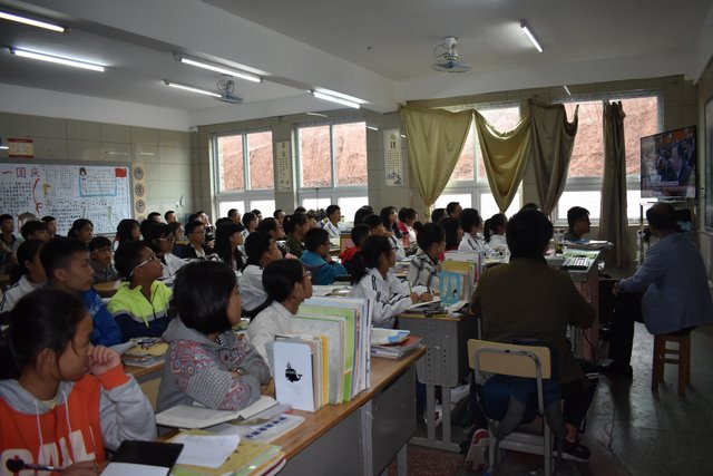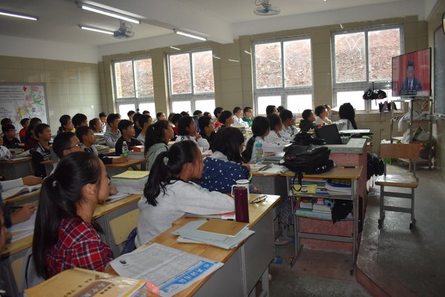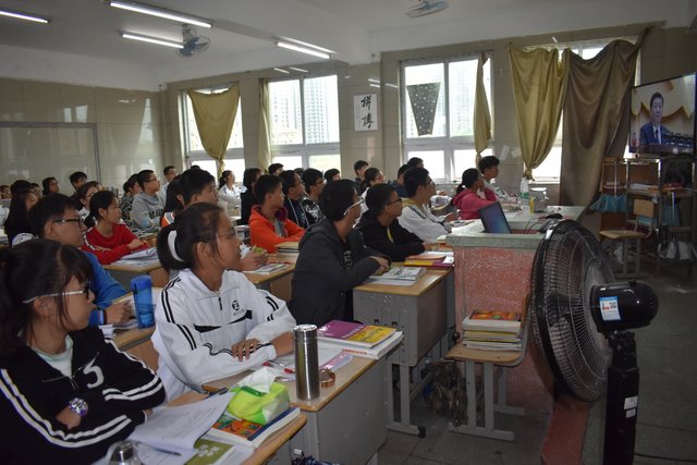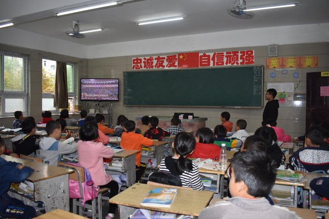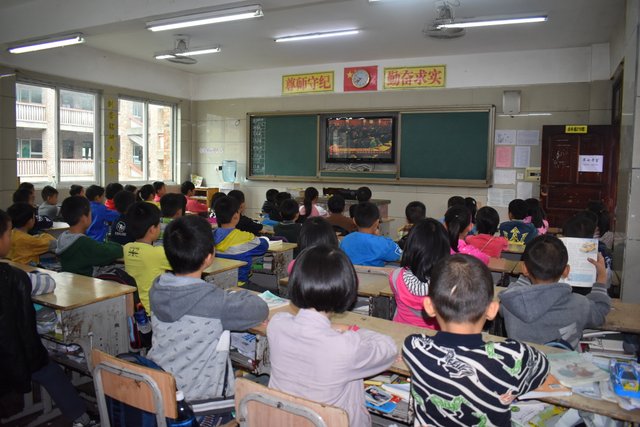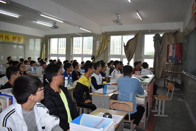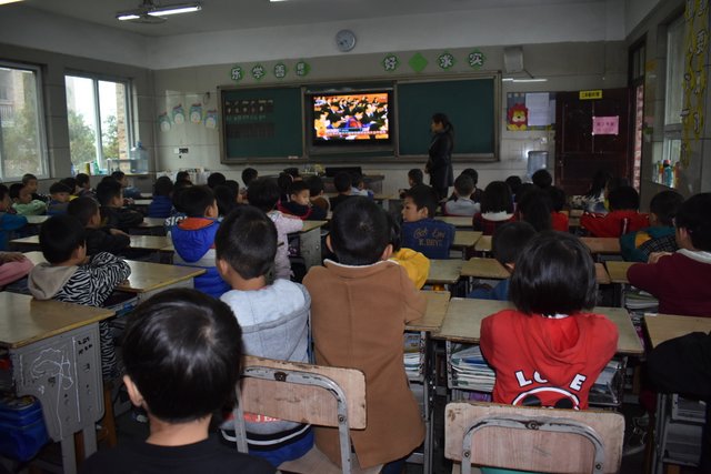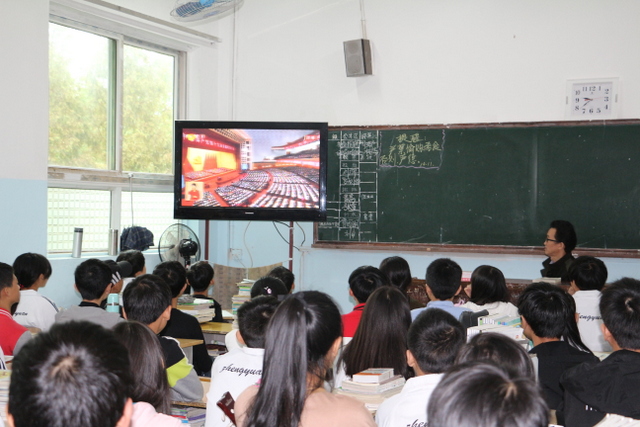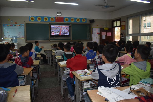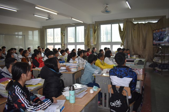 从幼儿园、学前班,到高三,各班同学端端正正地坐在自己的座位上,目不转睛地看着前面的电视机,聚精会神地听着习总书记工作报告里所讲的每一句话,每一个字,有的同学还不时地做着笔记。每当听到精彩之处时,教室里总是一次又一次地响起热烈的掌声。