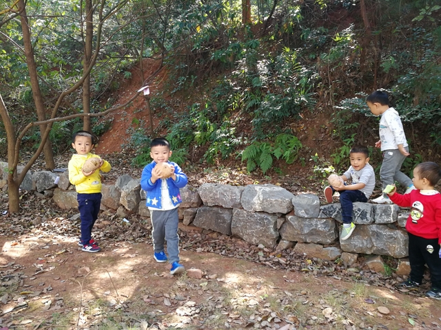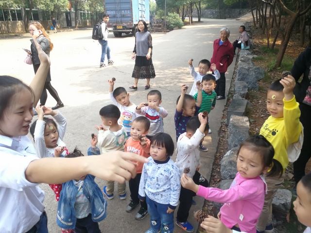 松树结的松果,这是秋天送给我们的礼物。孩子们在树丛里,落叶里寻找掉落的松果。这是绝好的手工材料,我们带回幼儿园。