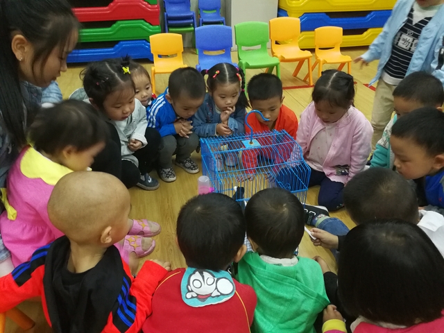 来了一位新朋友“八哥”,它可是一只会说话的八哥哦。孩子们不但可以近距离地观察八哥黑色的羽毛、白色的翅斑,还可以与它对话呢。