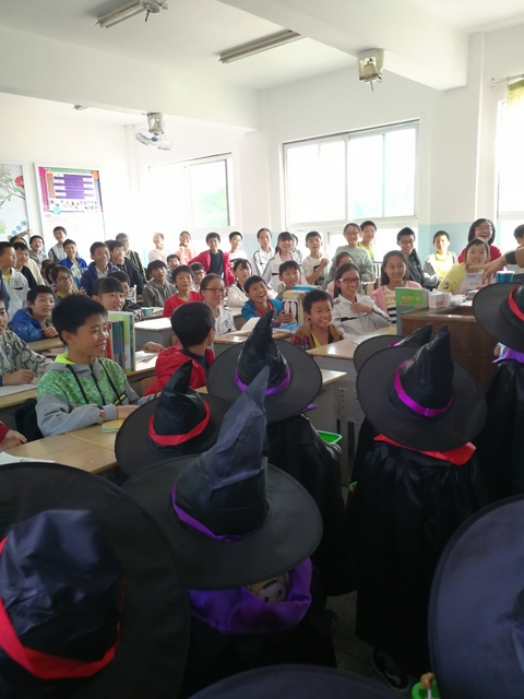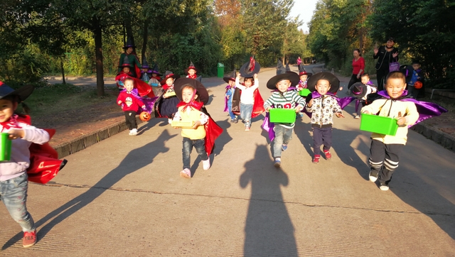10月31日,我们用一天时间,给孩子们讲解了西方万圣节的由来,告诉他们欧美国家的孩子们在这时候会做些什么。我们也借机体验了一次讨糖的欢乐。仅仅2小时的活动,孩子们收货颇丰。为了讨糖,他们大胆地在其他老师面前唱歌;偶遇初中英语课堂,受邀进教室捣蛋;走了两个小时,一点都不觉得累;把自己的糖果分享给其他伙伴……