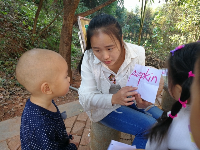 我们设计了找南瓜的游戏:找到藏在树林里的南瓜,和写有南瓜的卡片,就可以获得奖励。因为藏了许多其他字卡,所以在这个过程中,很自然地帮助孩子们巩固了一些字词。