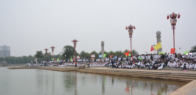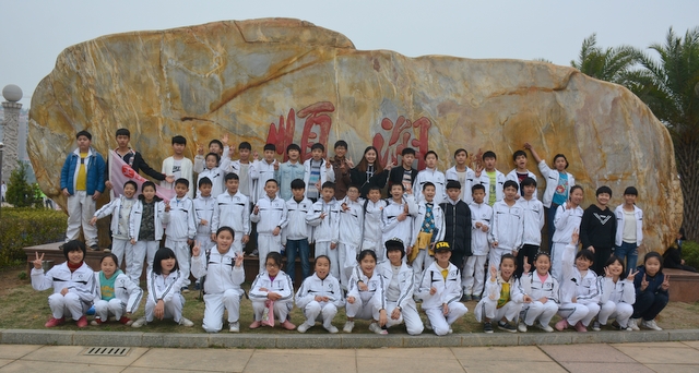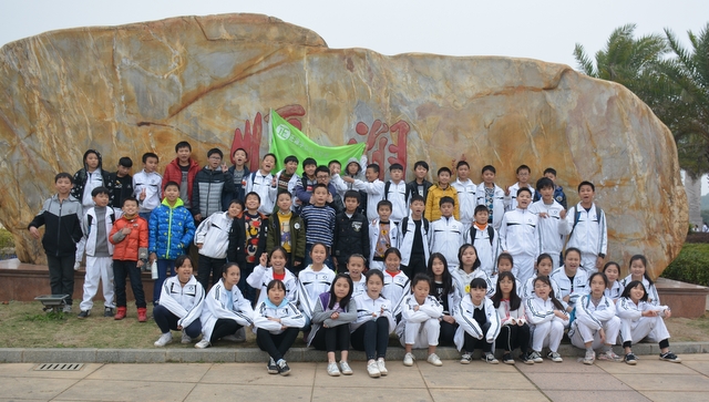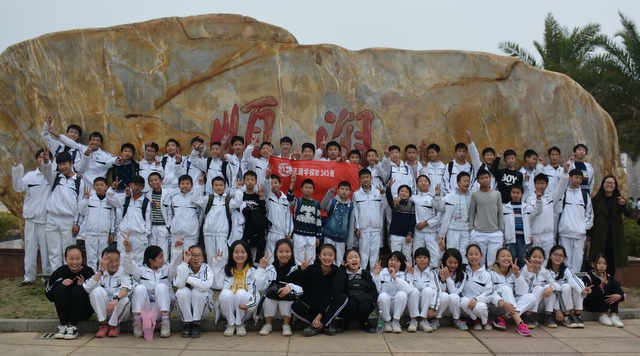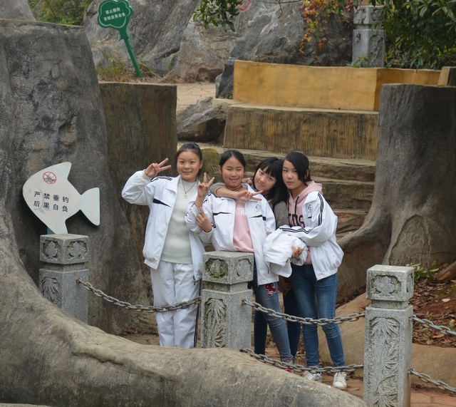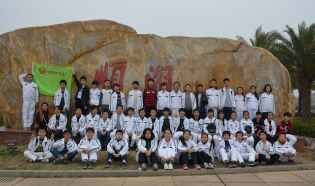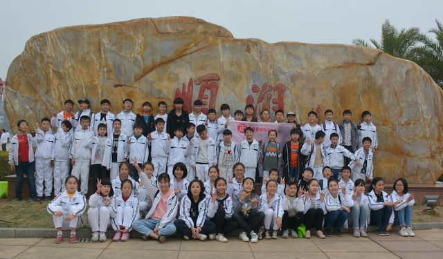 山中景色虽美,但论及风景,有山又怎能少了水呢?梁园虽美,不是归乡,流连在南岭仙的学生们也很快也转移了阵地,前往这次冬游的最后一站顺湖。循山而下,在山腰处就看到半掩其色的顺湖,顺湖以其独特的神秘感吸引着孩子们向它走去,大家怀着激动的心情下了山直奔顺湖。一到里面,班主任就开始组织班级留影,或在题石之下,或在立柱之旁……拍完班级合照的孩子们三五成群围着顺湖玩耍,只待班主任的一声呼唤,立刻归位配合拍年级合照……