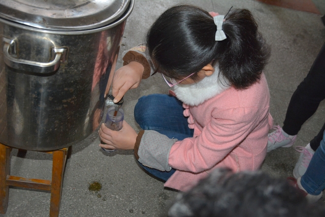 笔者随意走进小学部四年级211班教室,问同学们喝过姜汤没,学生异口同声答道:“喝了!”又问:“好喝吗?”“好喝!”。再问:“怎么好喝呀?”这时班里像炸开了锅一样:“姜汤好甜!”“喝了姜汤身子好暖和”,“姜汤还有一点辣”……人声鼎沸,欢喜之情溢于言表。