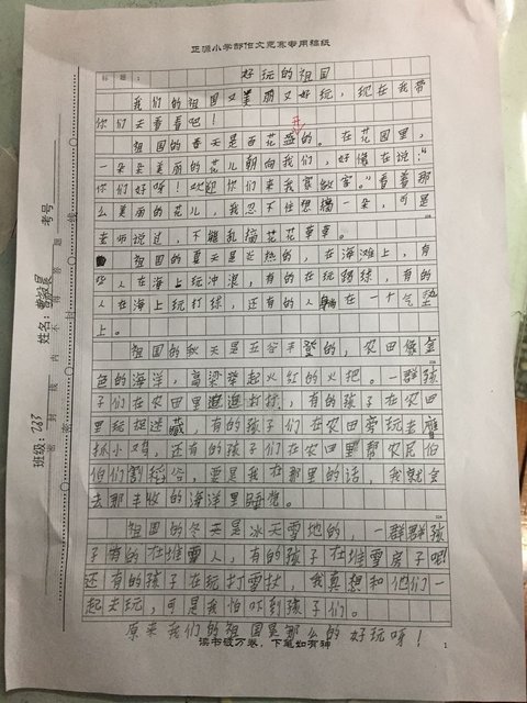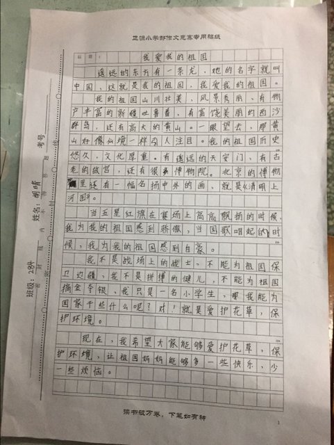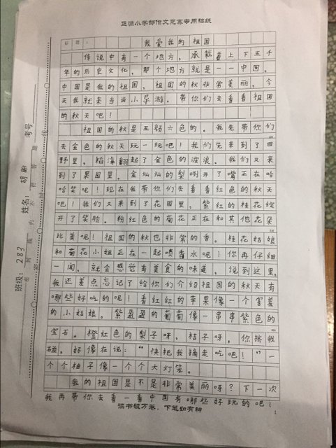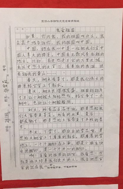 为锻炼学生写作能力,激发学生爱国热情,12月12号晚6:30——7:30,williamhill威廉希尔亚洲官网小学部三年级举办了“祖国在我心中”作文比赛,全体学生参与。
