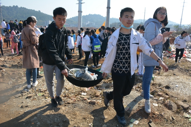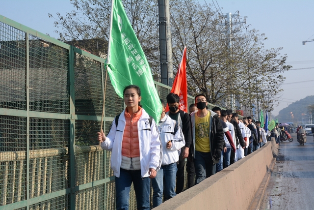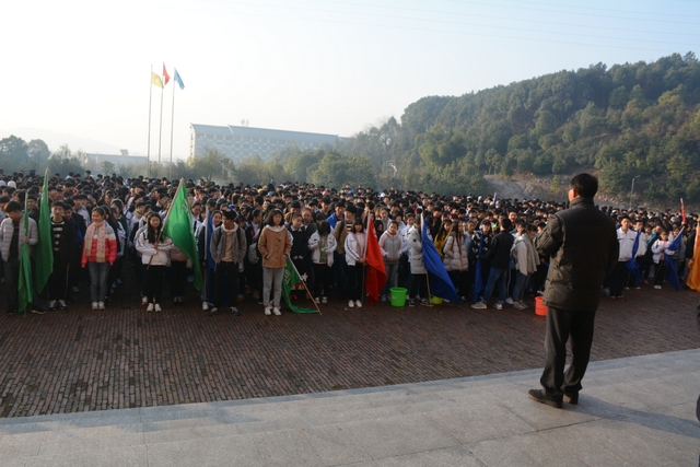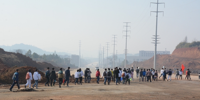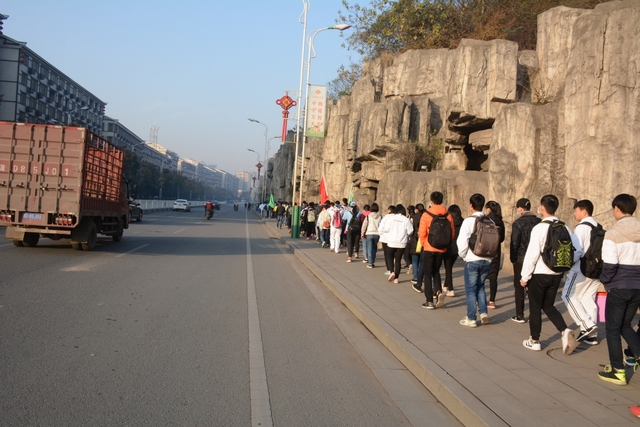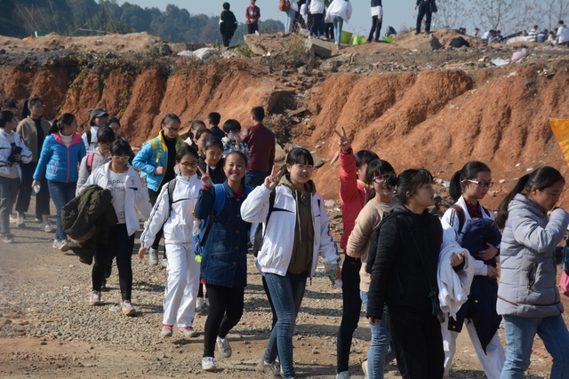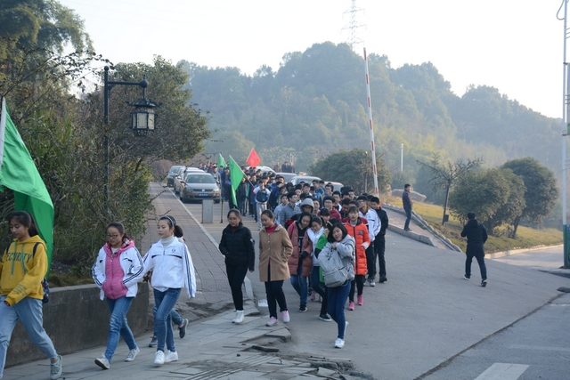 冬月的早晨,校园的广场还有些清冷,但聚集在广场的同学们热情似火。白色的校服映衬着一张张冻得通红的脸,呼出的空气化作缕缕轻雾。他们微侧着头认真地听年级主任强调注意事项,按捺不住出游的激动之心。只等陈主任一声令下“出发!”,各班便扬旗前进,向着南岭仙出发。这时,冬阳渐渐露出贪睡的脸,驱散了山间的清冷。伴着迎宾大道的声声汽笛,这些充满青春活力的学子一路高歌前进。沿途,沐浴着朝阳,穿梭于高楼旁,并肩而走畅谈生活与理想。一路虽风尘仆仆,却也是喜气洋洋。