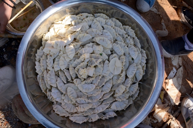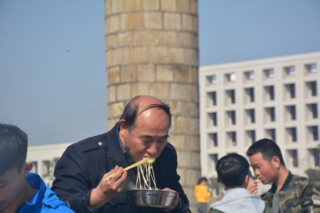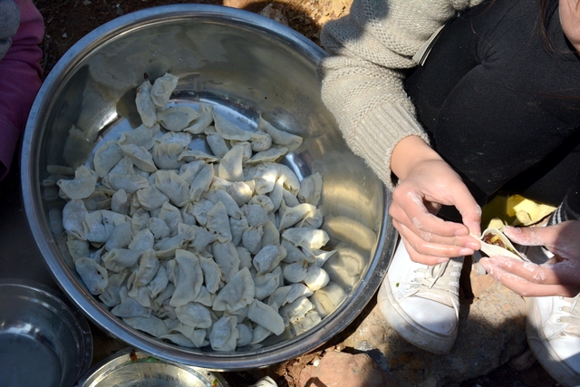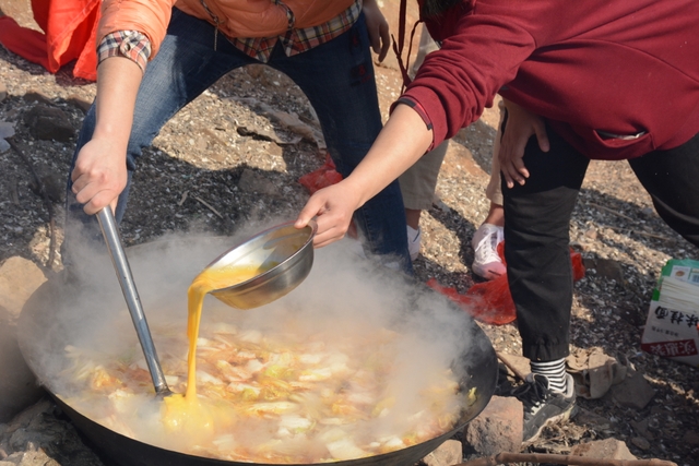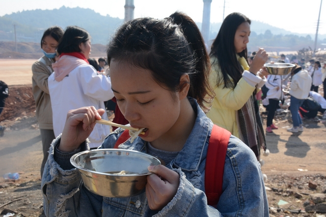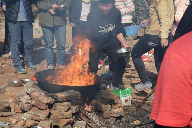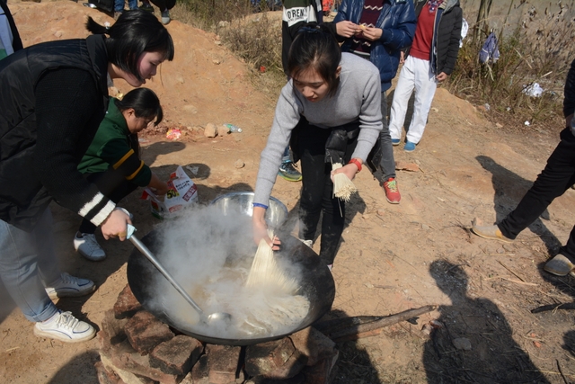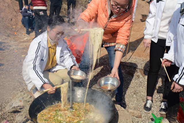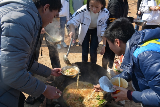 参观完寺庙后,同学们原路返回,到山脚的空地搭灶烧火,进行本次冬游的重要活动——野炊。在老师们的组织下,各班从学校的供给车上领了炊具和食材。然后分工合作,有的去打水,有的烧火,有的洗菜,有的掌勺…… 忙得不亦乐乎。很快,随着炊烟袅袅,一锅锅饺子,一碗碗面条,一串串烧烤的香气也扑鼻而来。同学们津津有味地吃着自己做的食物,脸上洋溢着满足和快乐。