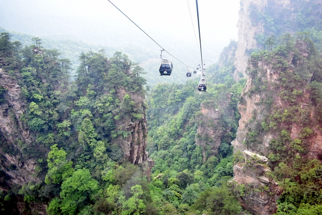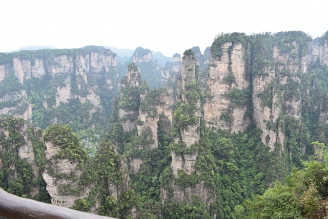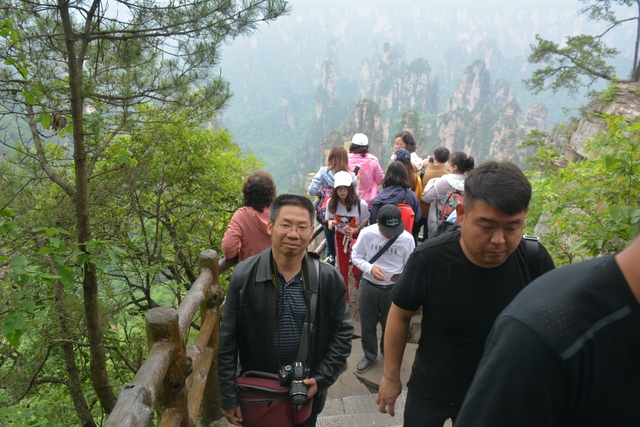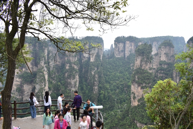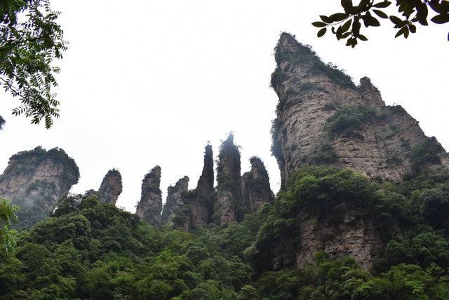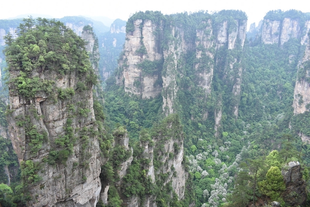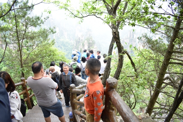 站在山顶,极目远眺,奇山异石郁郁葱葱,风景宜人。站在崖前,迎风而立,不免心有余悸。远处丛林矗立起一座座石柱子,直插云天。让人意想不到的是石柱上竟然还长出很多树,有的还很大。放眼望去,薄雾如轻纱般在石柱和群峰之间萦绕,恍然仙境,若不是人声鼎沸,真不知今夕是何夕。
