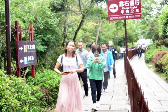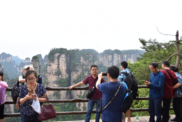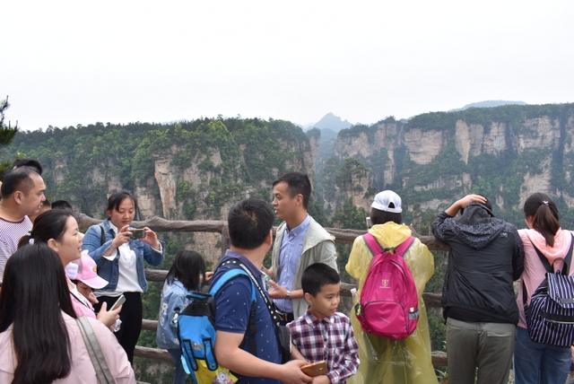 导游介绍,这里有“天下第一桥”、“阿凡达悬浮山”、“迷魂台”、“神龟问天”等很多景点,让我们慢慢的走,慢慢的看,规定时间到集合地就行。山顶设有观景台,游客甚多,看到好景致,想找个好位置拍照并不容易。