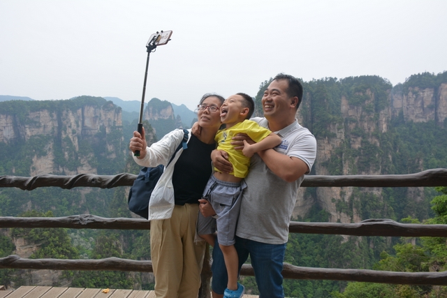 正源的老师年年旅游,“老”教师三山五岳几乎走遍了,他们三三两两从这个景点到那个景点,边走边拍照,轻车熟路。在袁家界,我印象最深的还有野生猴子,它们在峭壁上来去自如,从这棵树跳到另一棵树,面对游人的拍照和喂食,一点也不怕,甚至还从女老师手上抢苹果。它们俨然是山的主人。