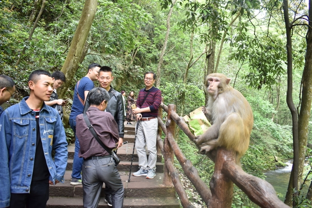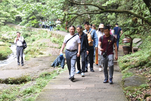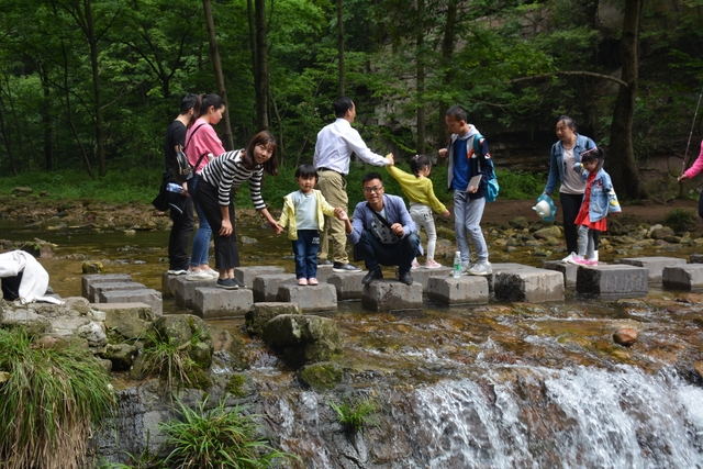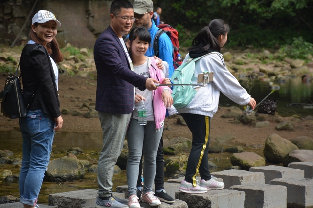 个别年轻的女老师忍不住走下沟里,掬起清水,玩起儿时泼水的游戏。为了拍到好照片,一些胆大的男老师竟然跨到溪水中间光溜溜的石头上。年长的老师基本是安安静静的走路,三三两两的拍照,不时来个深深的呼吸。