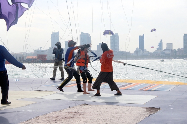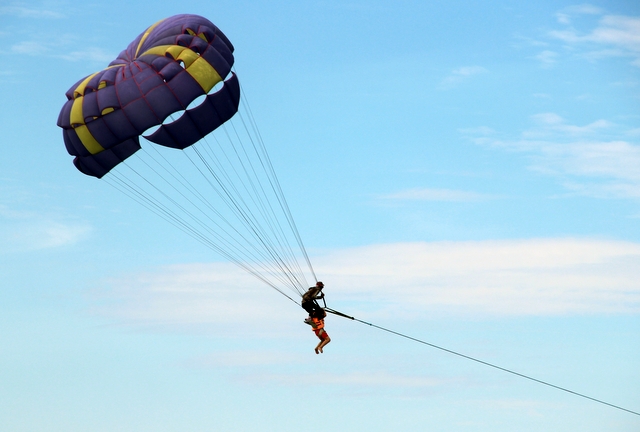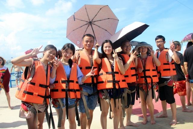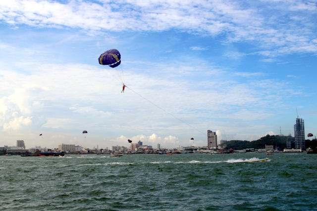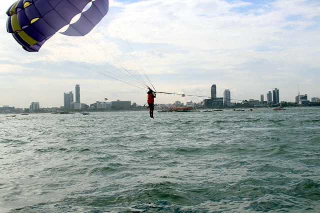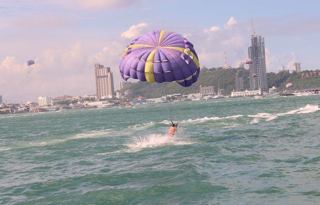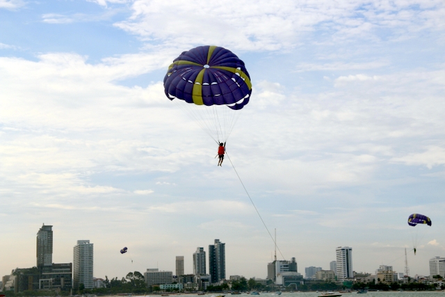 蓝天,白云,艳阳高照;芭提雅,金沙岛,精彩无垠。今天的第一个项目是坐降落伞。青年人奋勇当先,孩子们兴趣最浓,女老师不让须眉。大多数老师是第一次,有的难免有些提心吊胆,但没有人退缩。助跑,下坠,上升,上升,前行,降落……老师们在空中展开双臂,如夸父逐日,似嫦娥奔月,小孩子们像哪吒脚踏风火轮。白云让路,彩霞伴飞,把正源人的豪迈大写上蓝天。