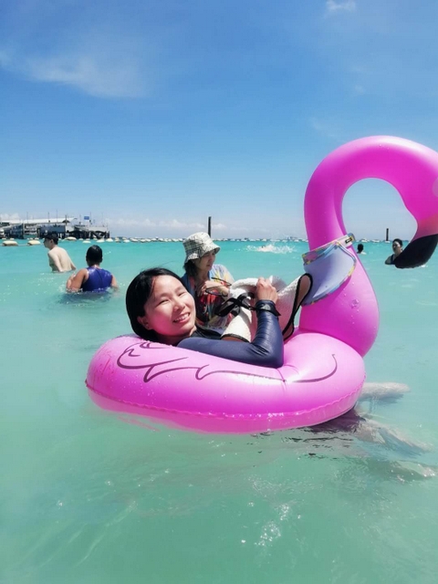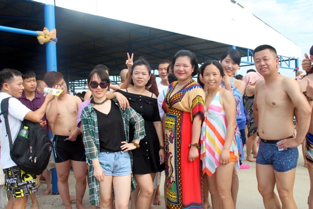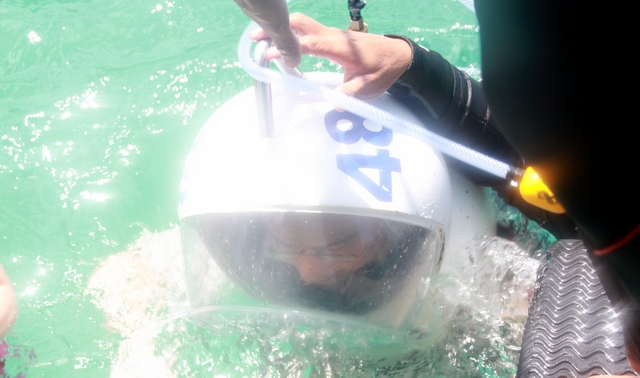 金沙岛上,最吸引老师们的项目是潜水。戴上重重的特制头盔,在导潜员的陪护下,漫步在海底,看鱼儿穿梭,海草摇曳,珊瑚婆娑,万类海底竞自由,别有洞天,一派生机勃勃的景象。