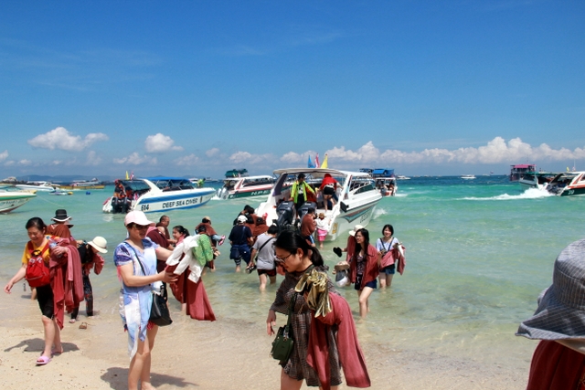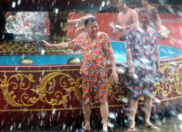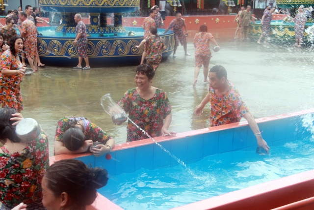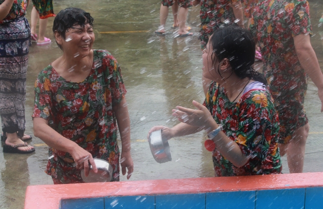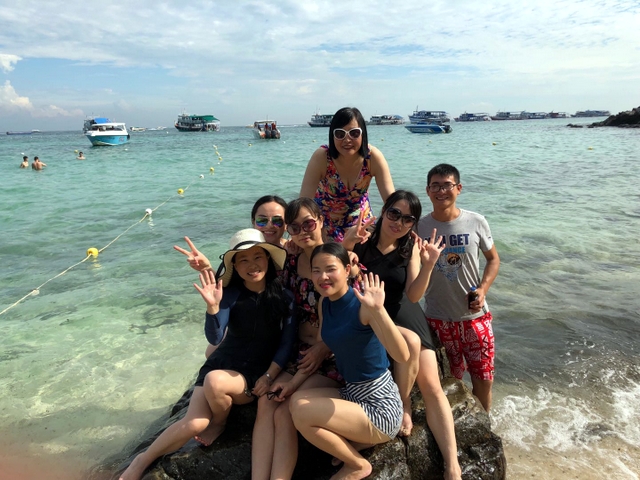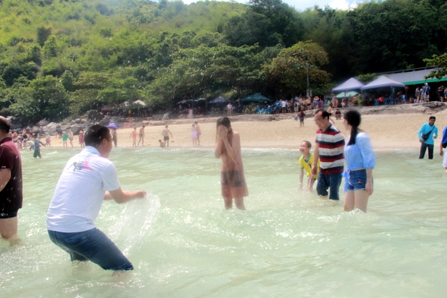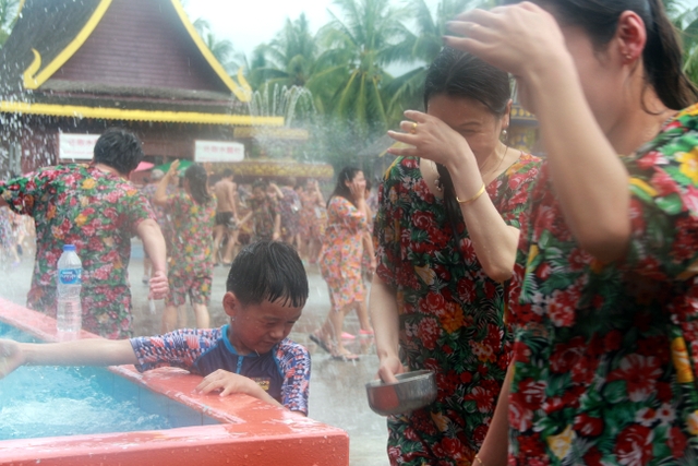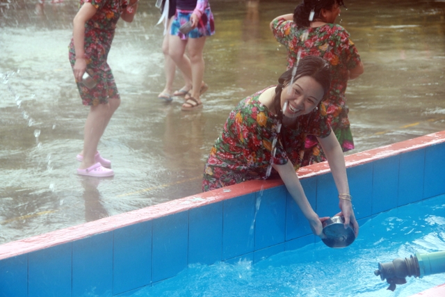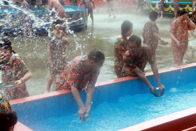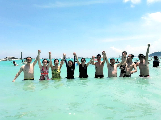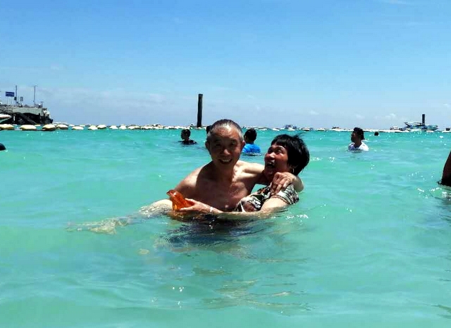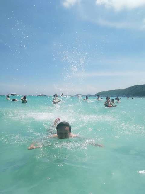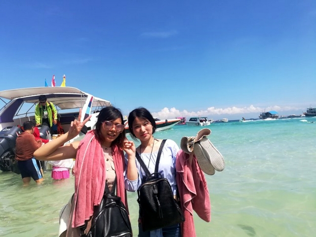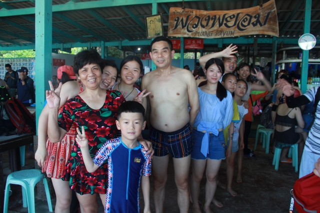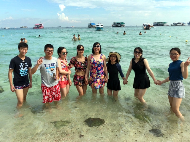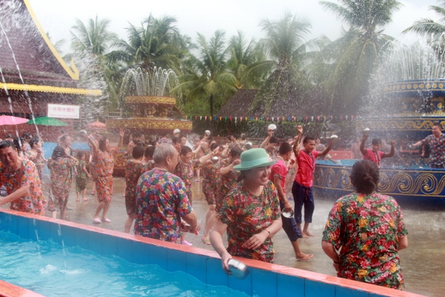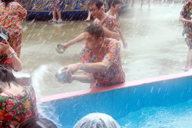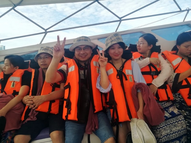 在岛上午餐后,再次坐飞艇返回市区。飞艇司机似乎刚填饱肚子,特别有精神,飞艇速度更快,犹如离弦之箭,射向彼岸。老师们来到泰国风情园,分享泰国春节——刚刚过去不远的泼水节的狂热。一个个换上泰国民族服装,欣赏了一段泰国民俗歌舞后,便直奔主题——泼水。男男女女,老老少少,生人熟人,你泼来,我泼去,有的打起水战,不泼到一方停下来不罢休。从头到脚,汗淋淋,水淋淋,笑泪淋淋,其乐无穷。