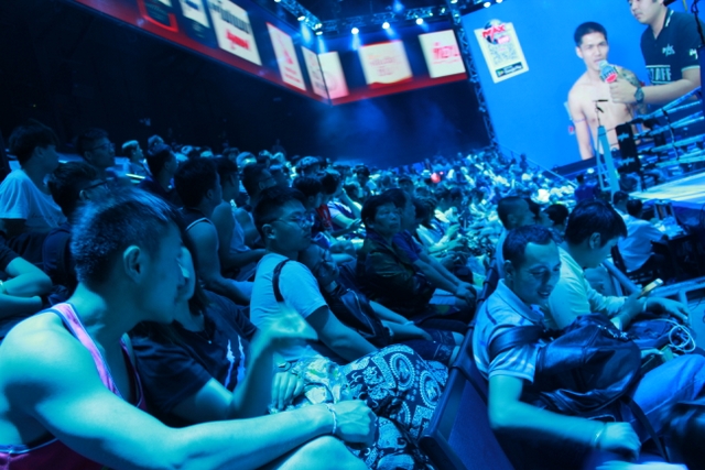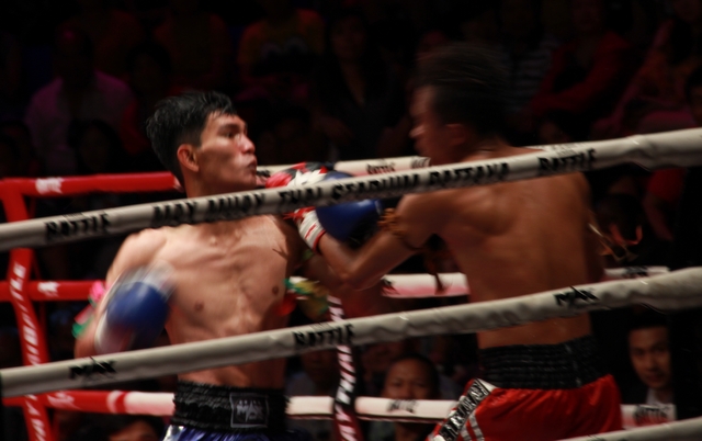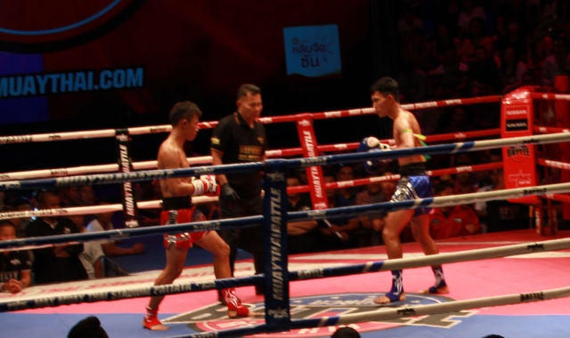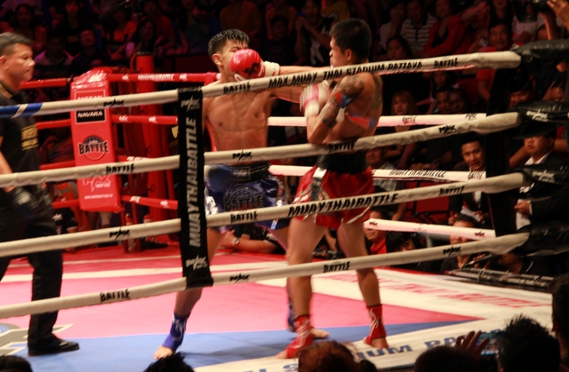 晚上,又是一个自愿自费项目——观看泰国国粹泰拳比赛。共有五组选手。除了第二组蓝装选手是老挝籍外,其他9名选手全部是泰国籍。比赛虽然天天都有,但并非作秀假打。老挝选手上场即攻势凌厉,大有一鼓作气、速战速决之势,不料在第二局被对手打破右眼下部,鲜血直流,形势急转直下,只有采取守势。第二局结束后,经过处置、休整,在第三局中稳打稳扎,顽强坚持,适时出击,最终以3:2的战绩获胜。第三组实力悬殊。在第一局比赛开始后仅仅一两分钟,蓝装选手一飞脚制胜,踢中对方头部,红装选手再也爬不起来,小组比赛结束。第四组两名选手身高都在1米80以上,红装选手背上纹着整半身龙。双方以脚踢为主,经常缠绕在一起。第一局红装颇有优势,第二局相持异常激烈。第三局蓝装连续短腿发力,转败为胜。第五组是两名轻量级选手,都是1.65米高,54.5公斤重。红装选手左臂、右肩纹身。这两名选手似乎更讲究技巧和策略,开始都是试探性、防御性,节奏徐缓,不像前面的几组那样猛打快攻,缺乏观赏性。第二局,两人同时发力,节奏加快,力度加大,拳打脚踢,紧张激烈,难分高下。第三局双方你打我一拳,我踢你一脚,你来我往,扣人心弦,打满了三局。看攻势,蓝装似乎频率更高一些。结果出来却是红装获胜。