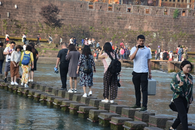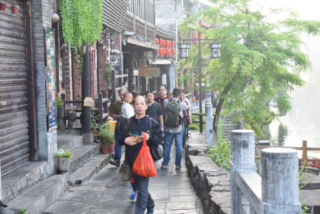一百多位正源人,分散徜徉在沱江岸边的石板路上。那些多次在梦里出现的吊脚楼,细脚伶仃的立在沱江里,似一幅韵味颇浓的山水画。楼上每一面墙,每一扇窗,每一根木条,似红非红,似黑非黑,古色古香。那些偶尔打开的窗户,让人遐思:窗户里是否会飘下来一片手绢,落在游人的头上?