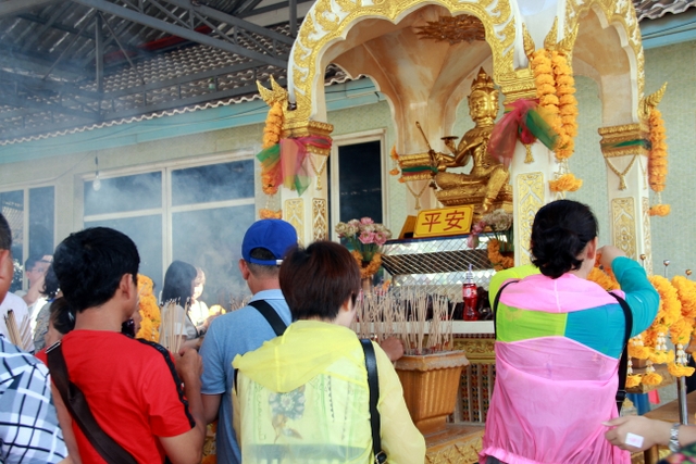 泰国是个佛教胜地,佛说相见就是缘分。今天,正源的老师们就有缘参拜了四面佛。四面佛共有四个面,有脚的那一面是正面,顺时针依次为:平安、事业、婚姻、财富);首先买一套香花:香12支、花环一串,金箔两张。从正面起沿顺时针方向参拜,每一面上3柱香,把花环挂在你想要实现的愿望那一面。然后随法师进正厅参拜释迦摩尼佛祖,再给佛像贴金箔。虔诚的心,有缘还能求得佛牌,为自己、为亲人保佑健康平安、聪明智慧、事业顺利。