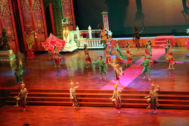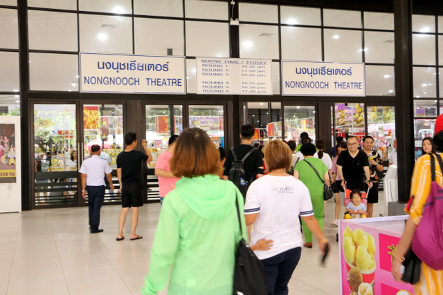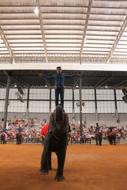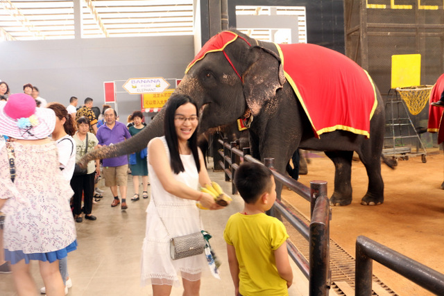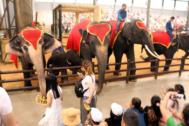 下午老师们来到了东巴乐园。东芭乐园占地1600多亩,是一个泰式乡村风格的休闲兼度假公园。观赏体验东芭乐园内的节目主要有泰国的民俗表演、大象表演二大部分。民俗歌舞很质朴地道,表演者就是村寨中人。瞅,那仿真舞台上的妹子民歌婉转,舞姿优美,对望深情脉脉,阿哥号角声声,擂鼓震天,雄壮豪迈,气势如虹。泰国的国粹泰拳表演逼真而不失诙谐幽默。大象环节的表演格外精彩,总能引人入胜。观众与大象的直接互动,如抱坐大象鼻子、给大象喂香蕉(花20泰铢就能拿一串的香蕉),给大象发发小费等,让大家尖叫连连,勾得胆大的游人们跃跃欲试。还有大象群体打篮球,踢足球,列队表演等活动也是精彩连连。