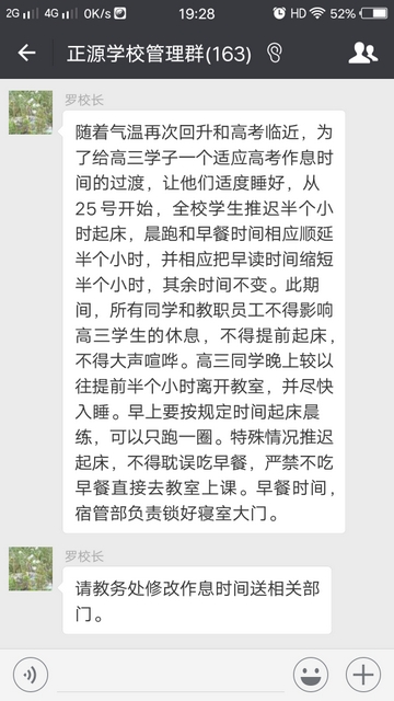 罗校长指示:随着气温再次回升和高考临近,为了给高三学子一个适应高考作息时间的过渡,让他们适度睡好,从25号开始,全校学生推迟半个小时起床,晨跑和早餐时间相应顺延半个小时,并相应把早读时间缩短半个小时,其余时间不变。此期间,所有同学和教职员工不得影响高三学生的休息,不得提前起床,不得大声喧哗。高三同学晚上较以往提前半个小时离开教室,并尽快入睡。早上要按规定时间起床晨练,可以只跑一圈。特殊情况推迟起床,不得耽误吃早餐,严禁不吃早餐直接去教室上课。早餐时间,宿管部负责锁好寝室大门。
