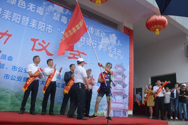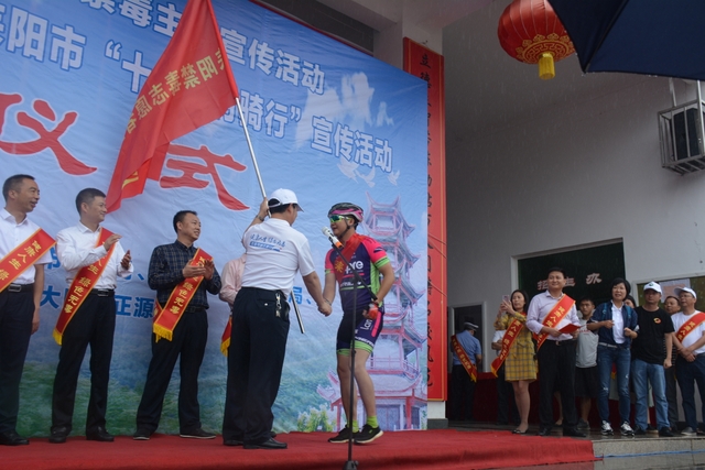 湖南省禁毒委副主任唐纯杰向耒阳禁毒志愿者授旗