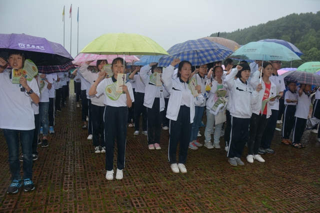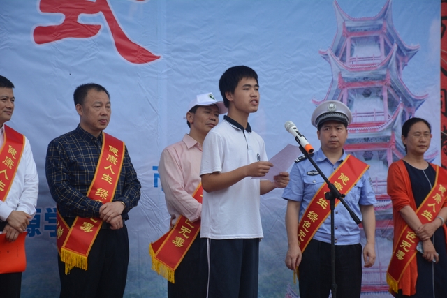 省“无毒驾驶万里行”队员代表李维发表禁毒宣言,并与我校的志愿者、学生进行了互动,开展了禁毒接力旗帜签名,发放了禁毒宣传资料。我校初二年级306班邓新荣同学代表禁毒志愿者发表了禁毒宣言,并带领与会人员共同宣誓。