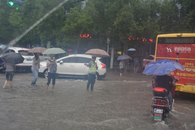 6月7日上午,考生还没进入考点,耒阳市区即开始下起大雨,上午的考试还没结束,城区部分路段就已经积水很深。尤其是职高考点前面的路段,积水已达到70厘米以上。花坛被淹,街道变成宽阔的河流。两端所有驶向这一路段的车辆纷纷调转车头,不少小车就抛锚在了威尼斯的“河”里。
