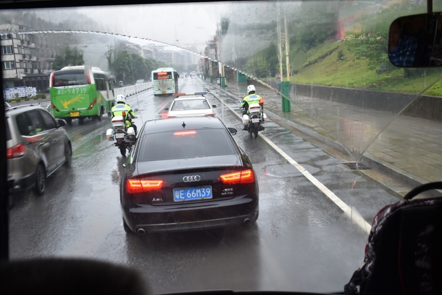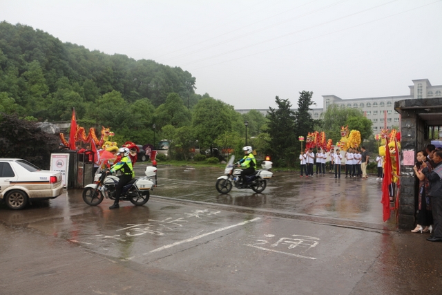 一前两翼,警车护卫着高考用车、学校财务总监梁晓芬的座驾