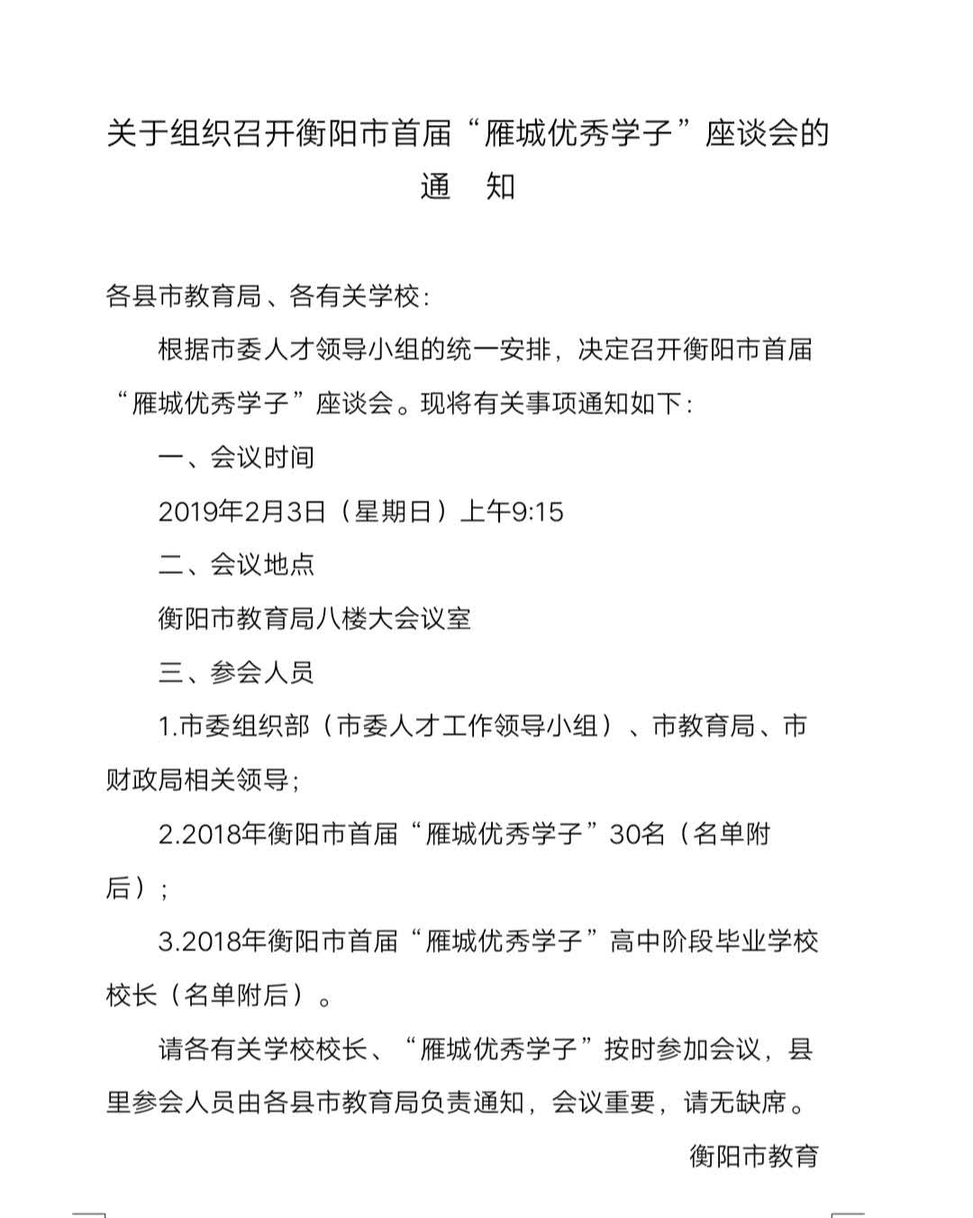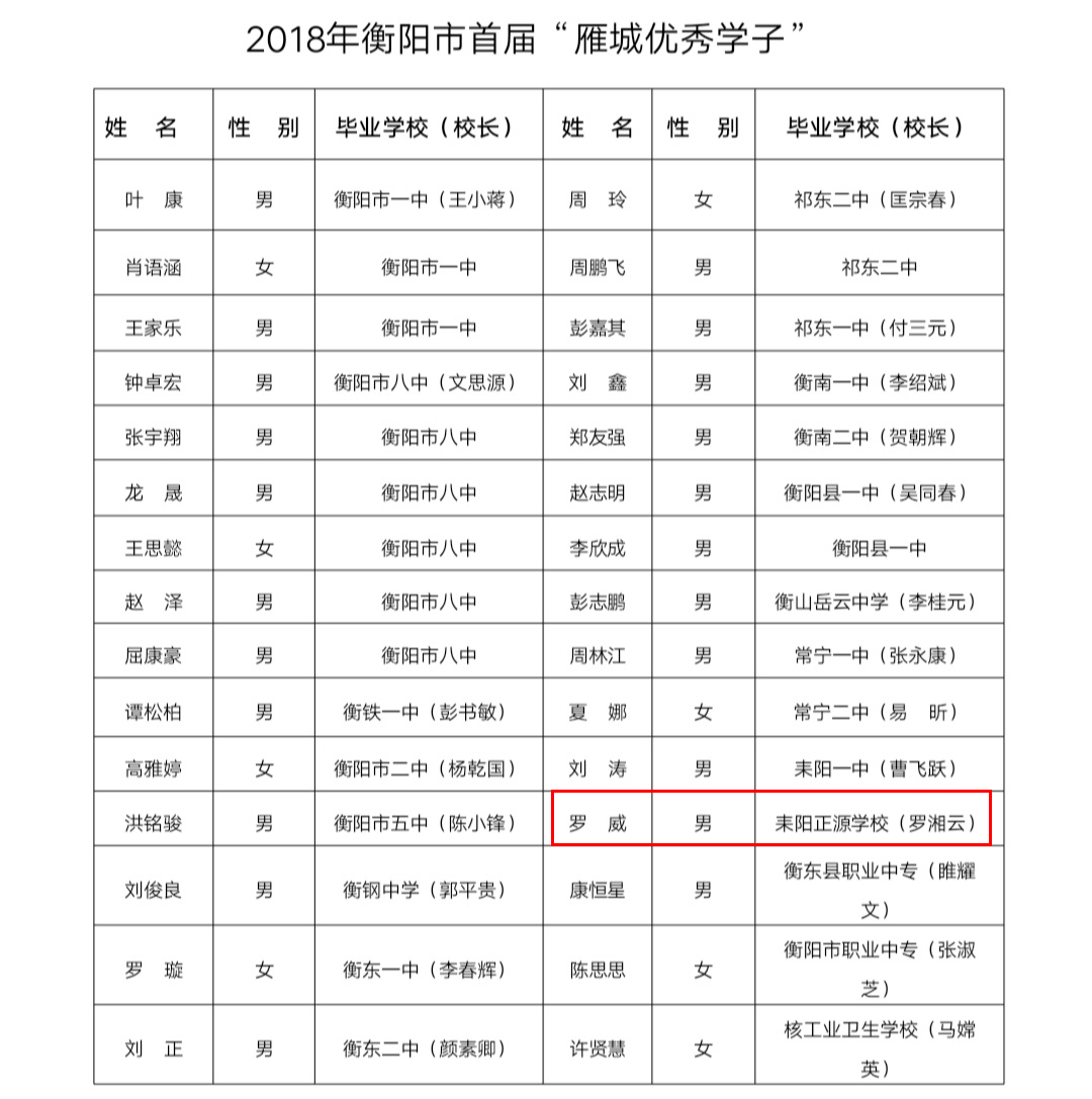 就在前几天,罗校长接到衡阳市教育局通知,2月3日参加衡阳市组织部人才工作领导小组组织召开的衡阳市首届“雁城优秀学子”座谈会,2018年衡阳市共评选出30名“雁城优秀学子”,就读于空军航空大学的罗威榜上有名。