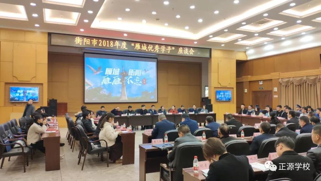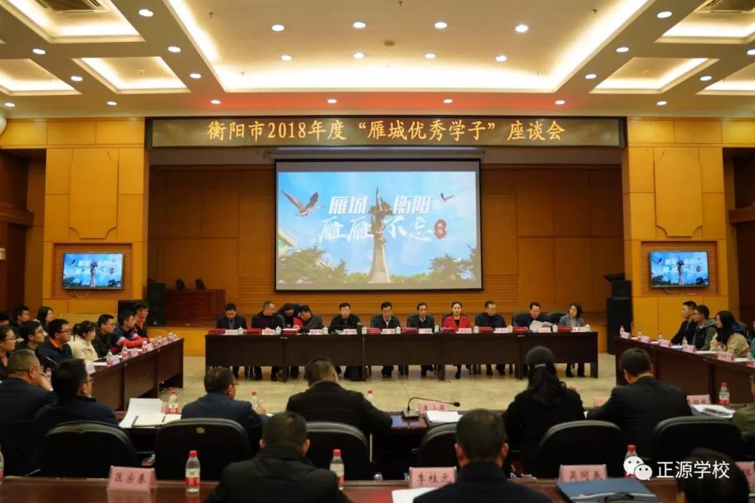 在新春佳节到来之际,由衡阳市委组织部人才办组织的衡阳市2018年度“雁城优秀学子”座谈会在衡阳市政府一楼会议室举行,市委常委、组织部长陈竞、常务副部长雷雨时、团市委书记翟亮月等领导参加了座谈会,衡阳市教育局长程少平主持会议,教育局领导班子在主席台上就坐。座谈会上,学生代表钟卓宏、彭嘉其、陈思思;校长代表王小蒋、李绍斌等做了重点发言。