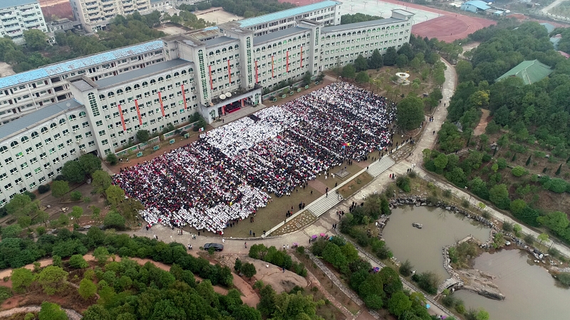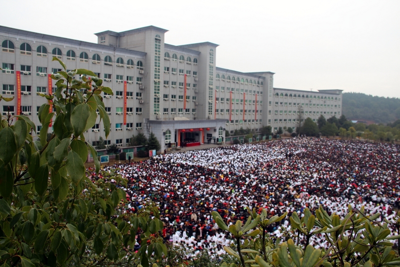 240米长的雄伟主体教学楼如展翅的雄鹰,拥抱着10000平方米的宽阔广场上端坐着的17000名学子。教学楼上垂挂着一条条励志标语,赫然入目,令莘莘学子激情喷发,热血沸腾。